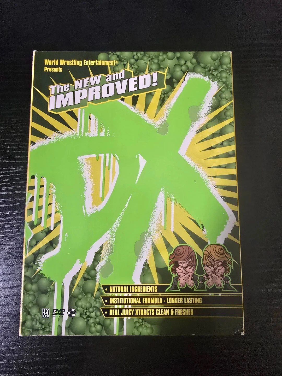 This is the World Wrestling Entertainment DX The New and Improved! DVD set. It includes multiple discs for a full viewing experience. Natural ingredients, institutional formula, and real juicy xtracts are listed on the packaging.