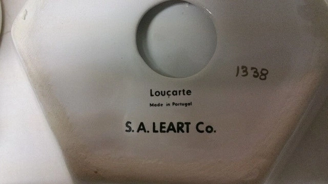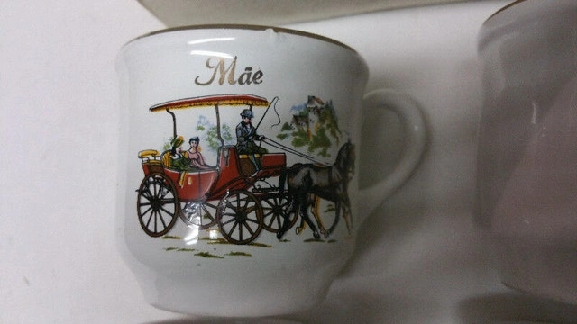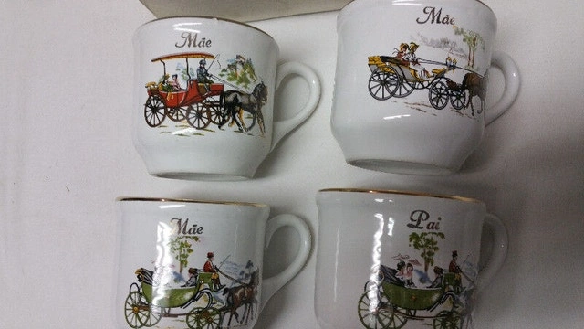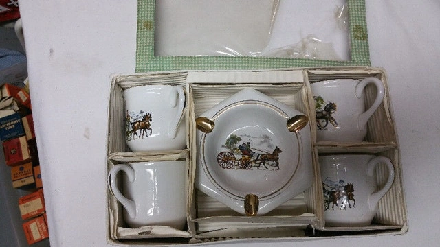 Up for sale we have this New Vintage set of 4 Coffee Cup Mugs and one Ashtray Made in Portugal By Loucarte S.A.Leart Co. the set future a couple riding a Carriage (buggy)with a horse The protective plastic on top of the box is rip but the set is still Brand New. I have 2 set available