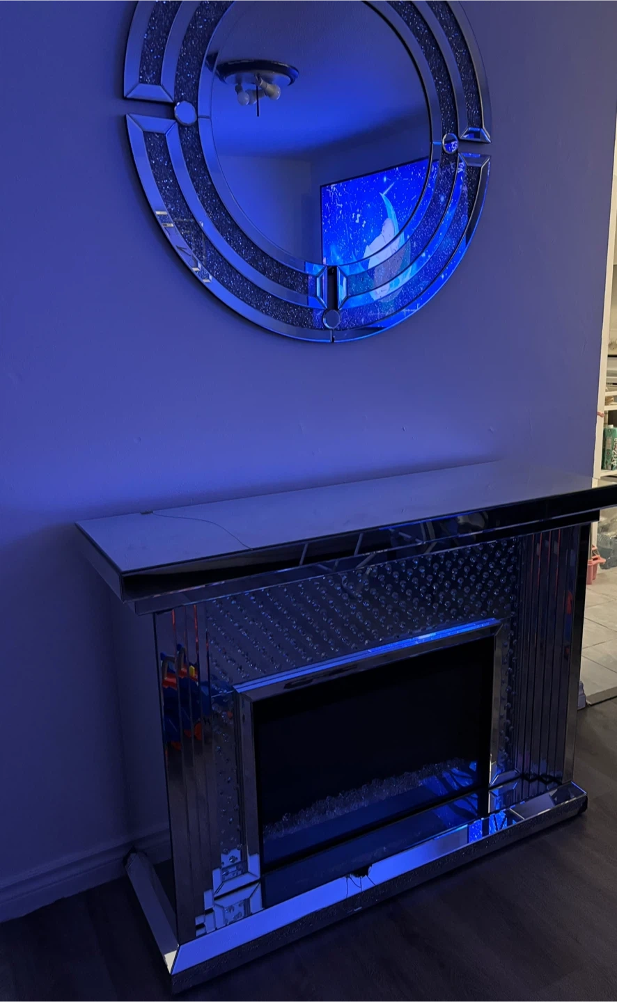Sparkling mirrored electric fireplace console with crystal accents. It's designed to add a touch of glamour to your living space. The unit includes a realistic flame effect and heating capabilities. This console would be a stunning centrepiece for any room!