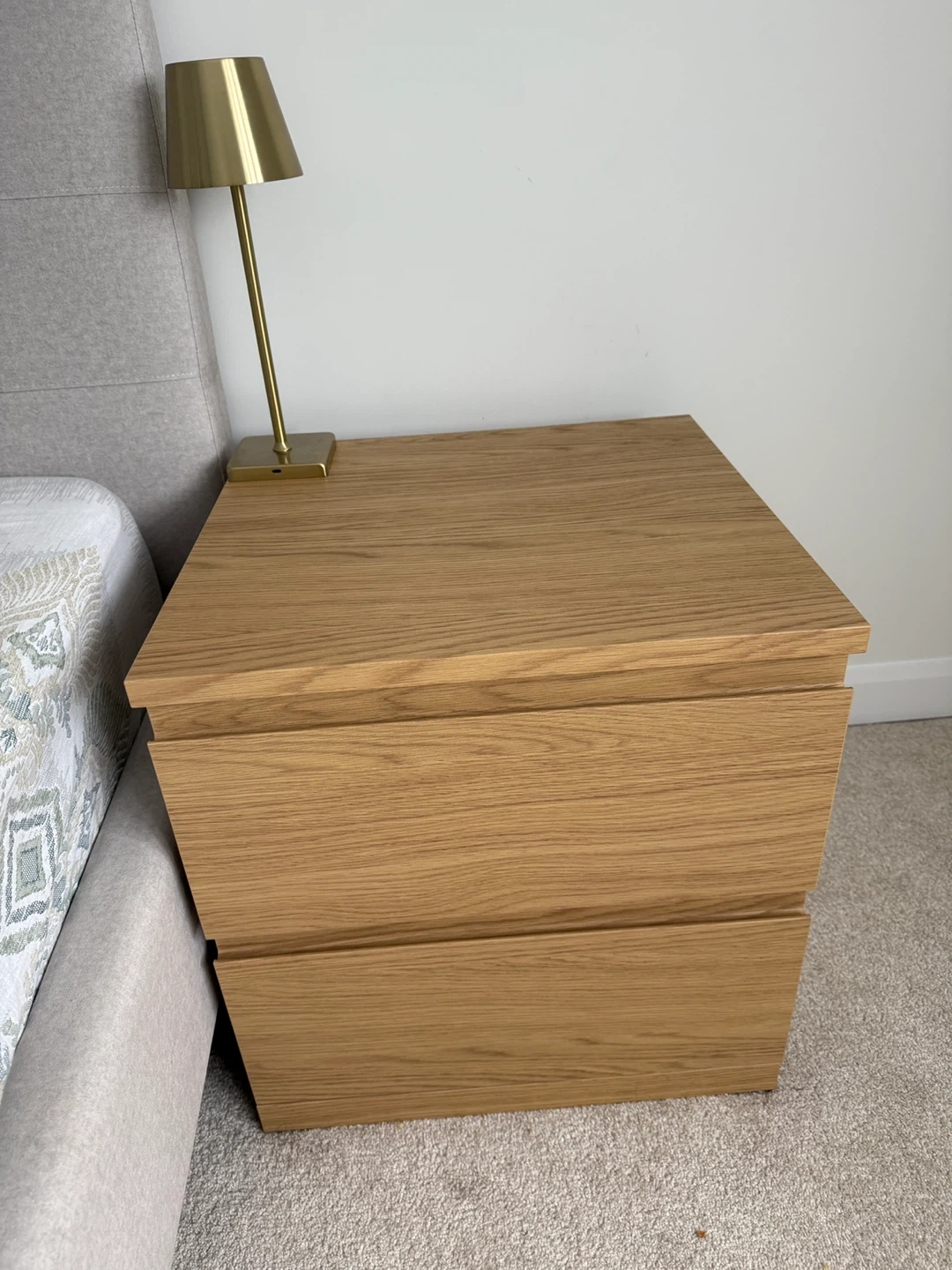 A neat wooden nightstand with two drawers. It's made from light-coloured wood with a natural grain. This nightstand provides handy storage beside your bed.