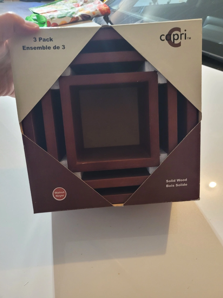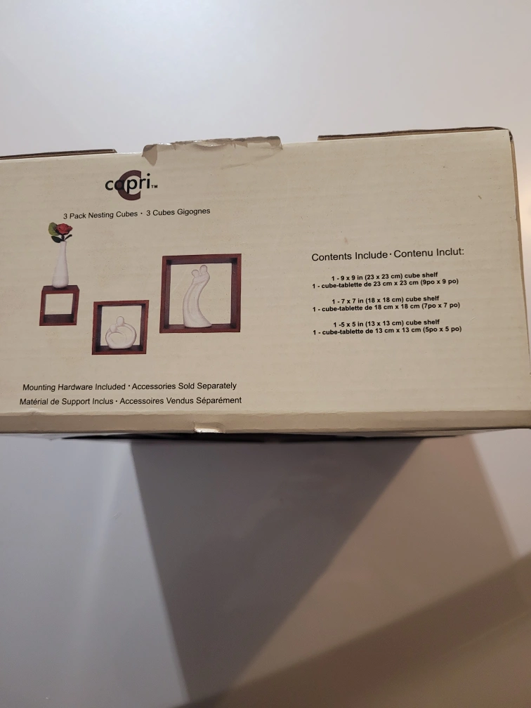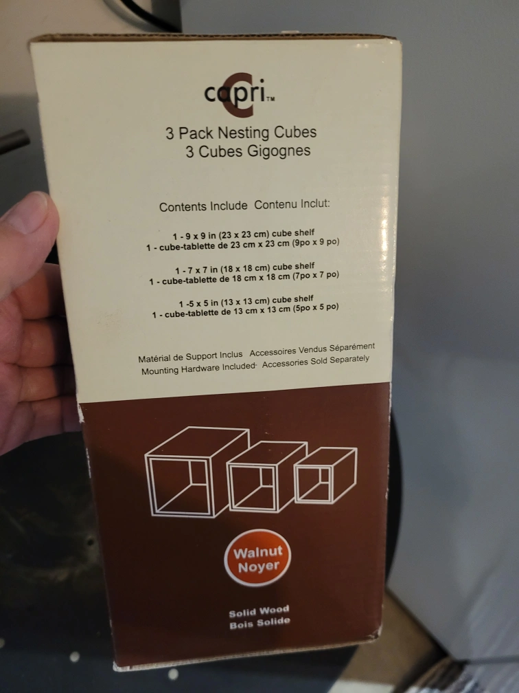 Three solid wood nesting cubes. Set includes one 9x9x9 inch cube, one 7x7x7 inch cube, and one 5x5x5 inch cube. Mounting hardware included. Accessories sold separately.