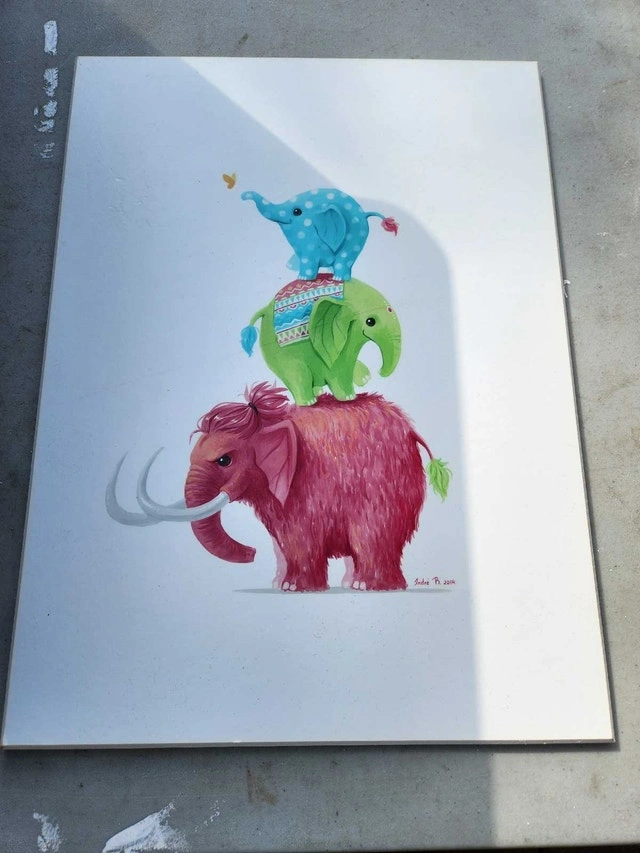 This is a captivating piece of art, featuring stacked elephants. The artwork is in good condition and would make a charming addition to any collection. It's truly a conversation starter! Add a touch of whimsy to your space with this unique painting. If the ad is up, it's still available! Cash accepted.