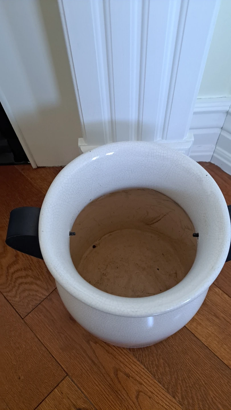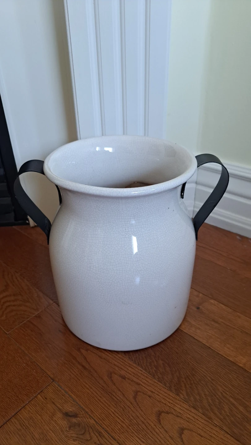 A lovely white ceramic pot with a decorative crackle glaze finish. It features sturdy black metal handles for easy carrying. Perfect for your favourite indoor plant!