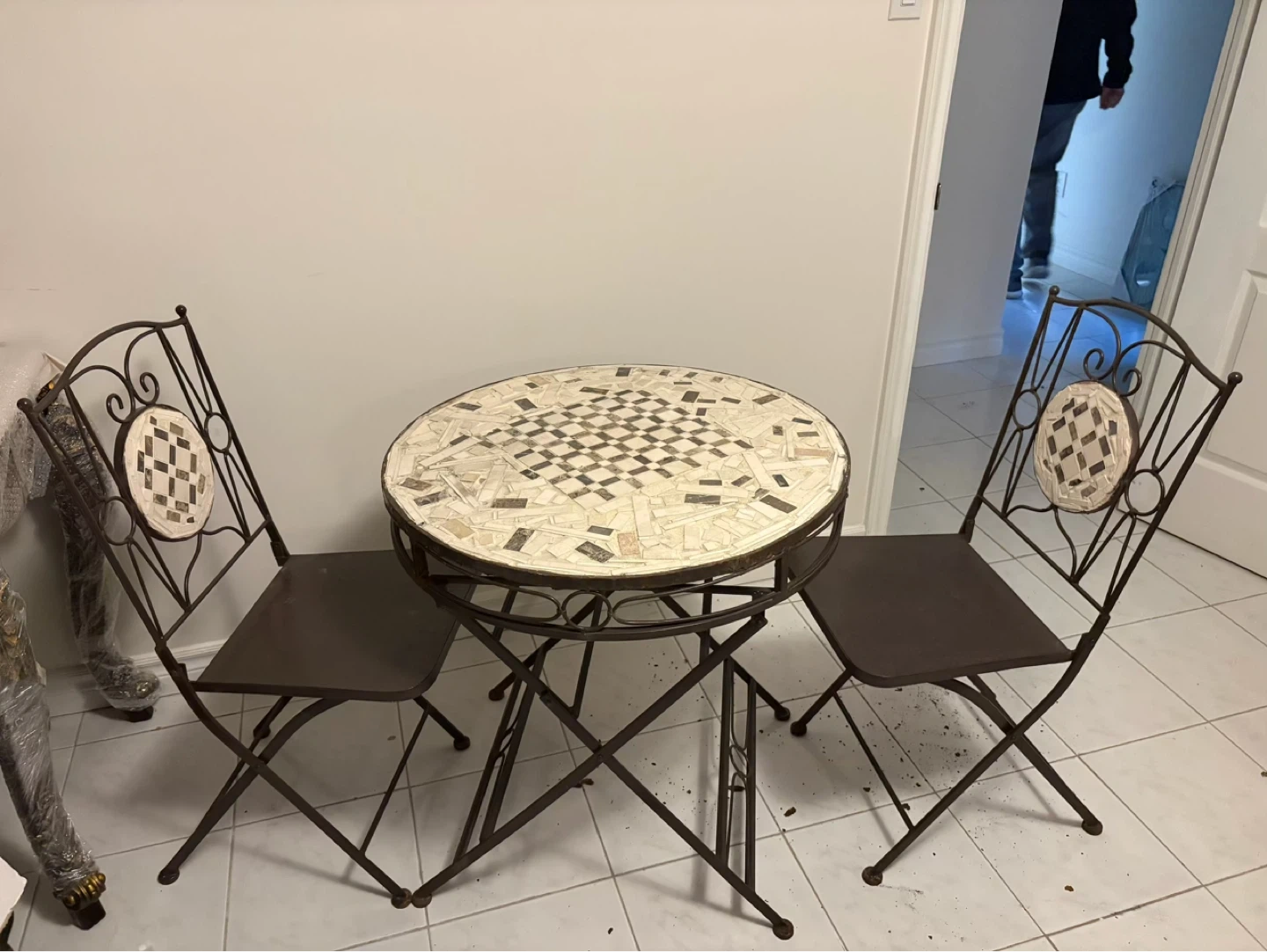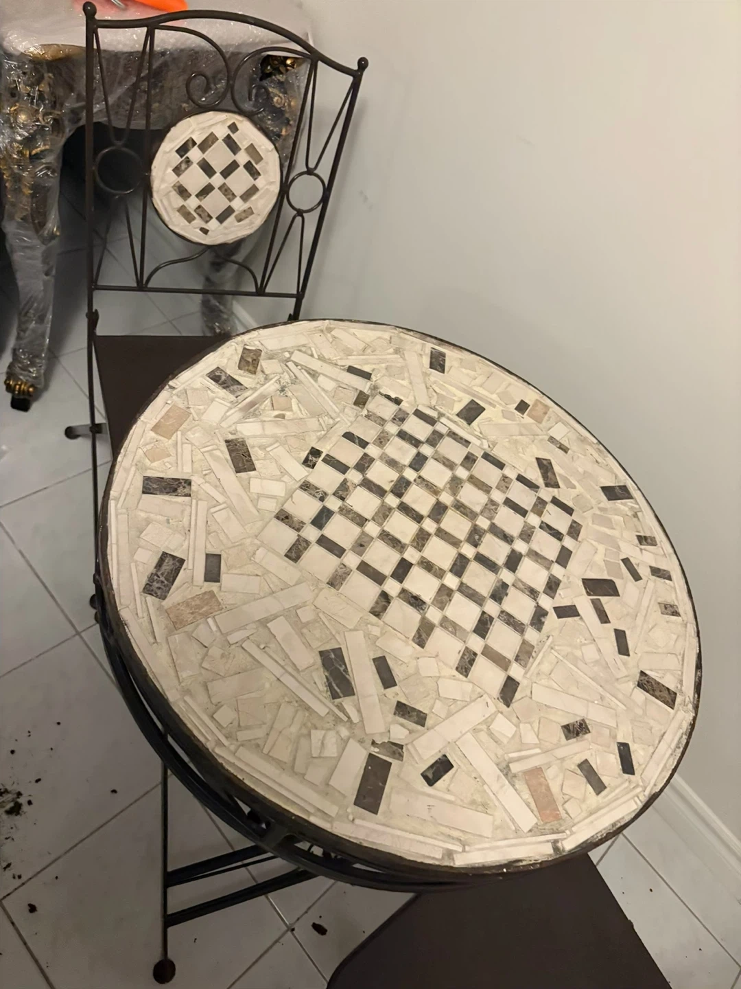 This mosaic bistro set includes a round table and two chairs. It's a great addition to any outdoor space. The table has a mosaic top with a checkerboard pattern. The chairs are made of metal and are foldable. There are rusted damage in underneath of table