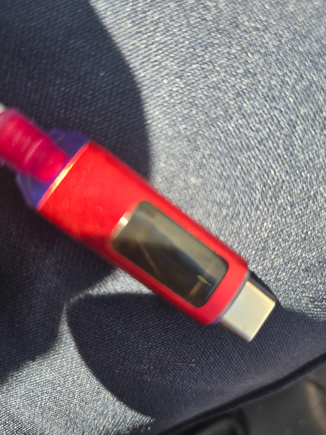 This is a red, coiled USB-C charging cable. It's made with a durable braided nylon exterior. It's great for keeping your devices charged on the go!