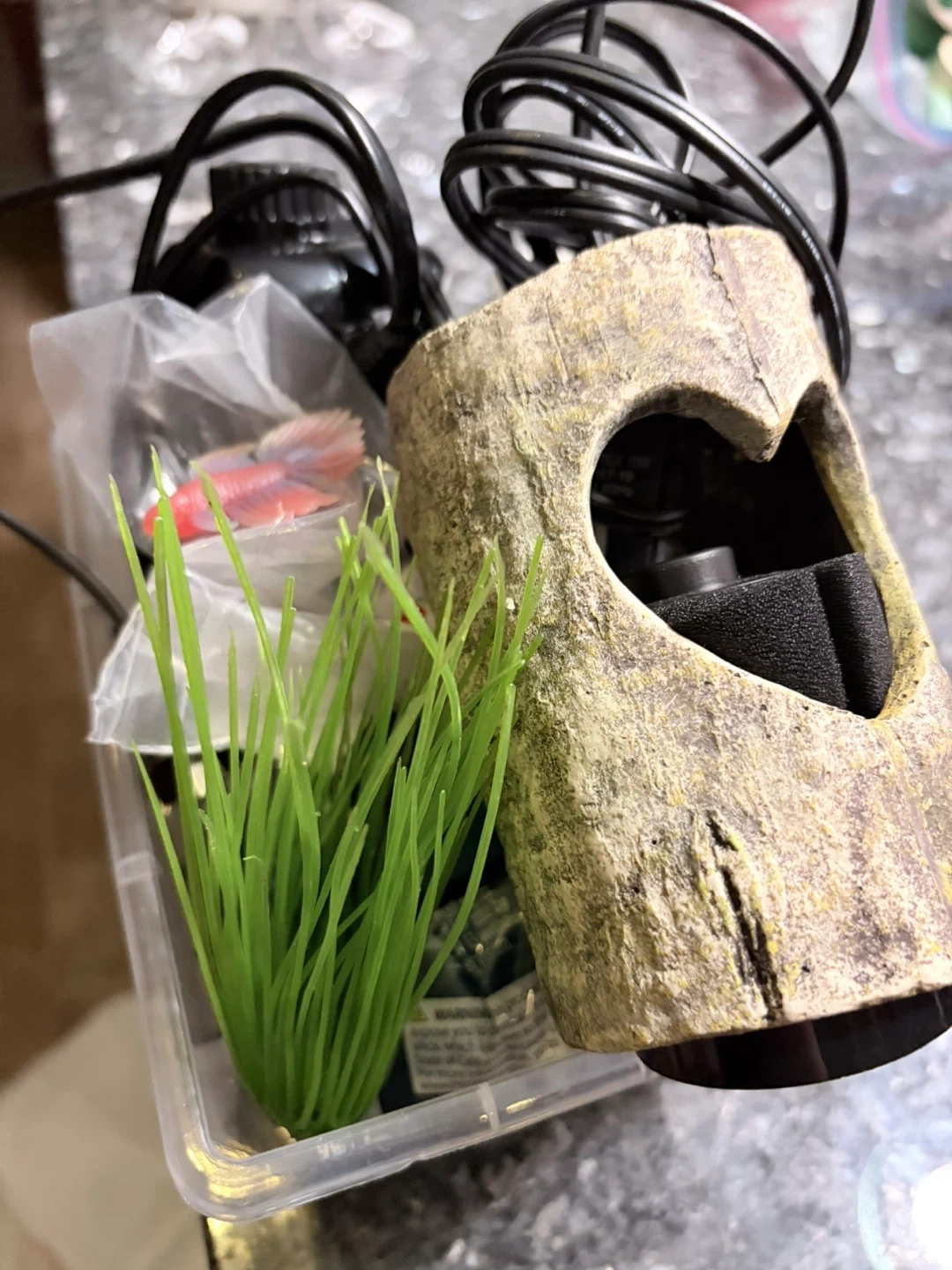 MOVING SALE. Cant take it with us …Complete aquarium kit with a Uniclife UL40 air pump. Includes a decorative tree stump hideaway with a heart cutout, artificial grass, and a betta fish ornament. Pumping air in the quietest way!