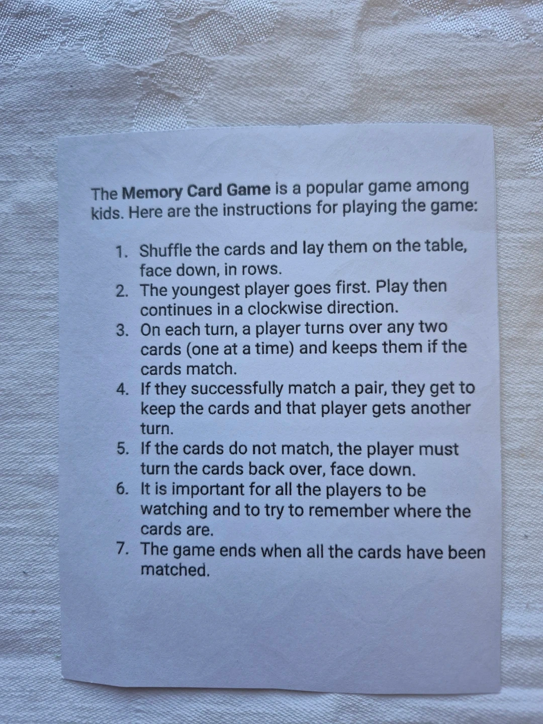 Selling a handmade memory card game for kids! It comes with a cute drawstring bag for storage and easy cleanup. The cards have different patterns and are great for developing memory skills. Perfect for young children to help train and develop concentration.