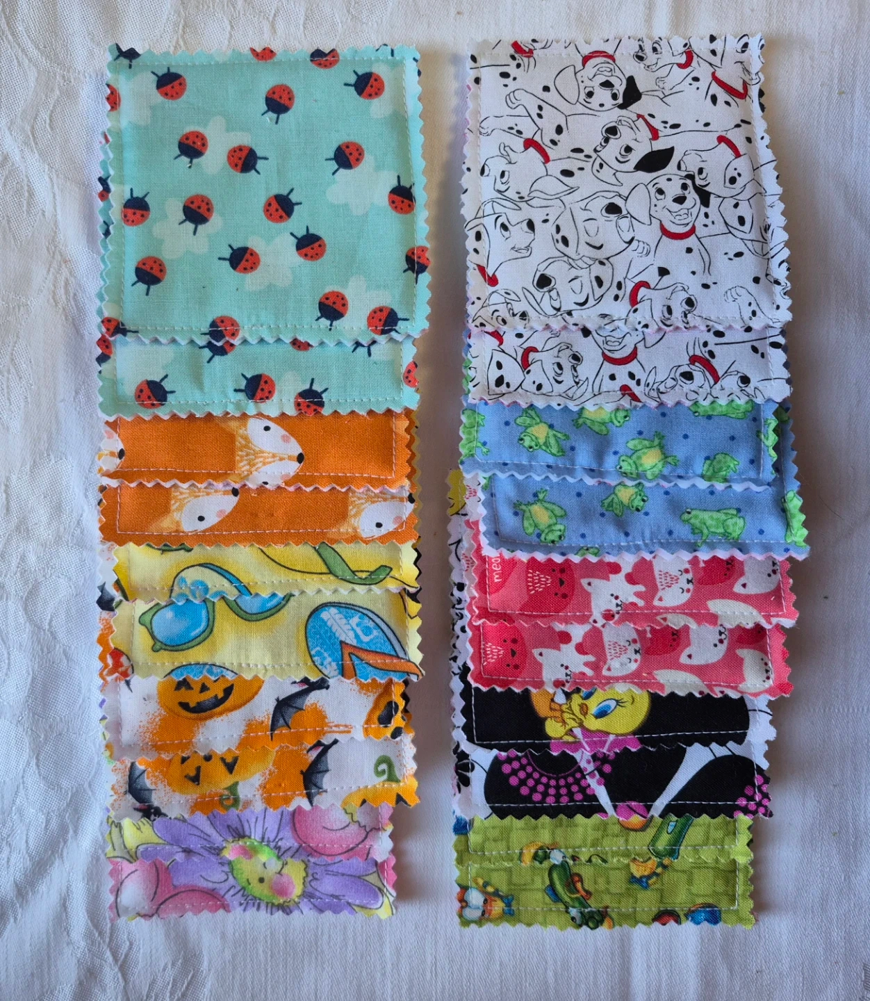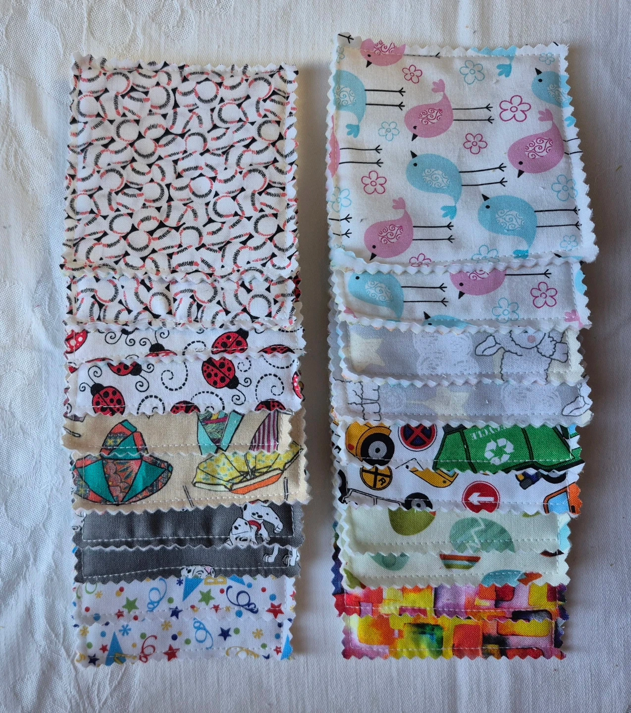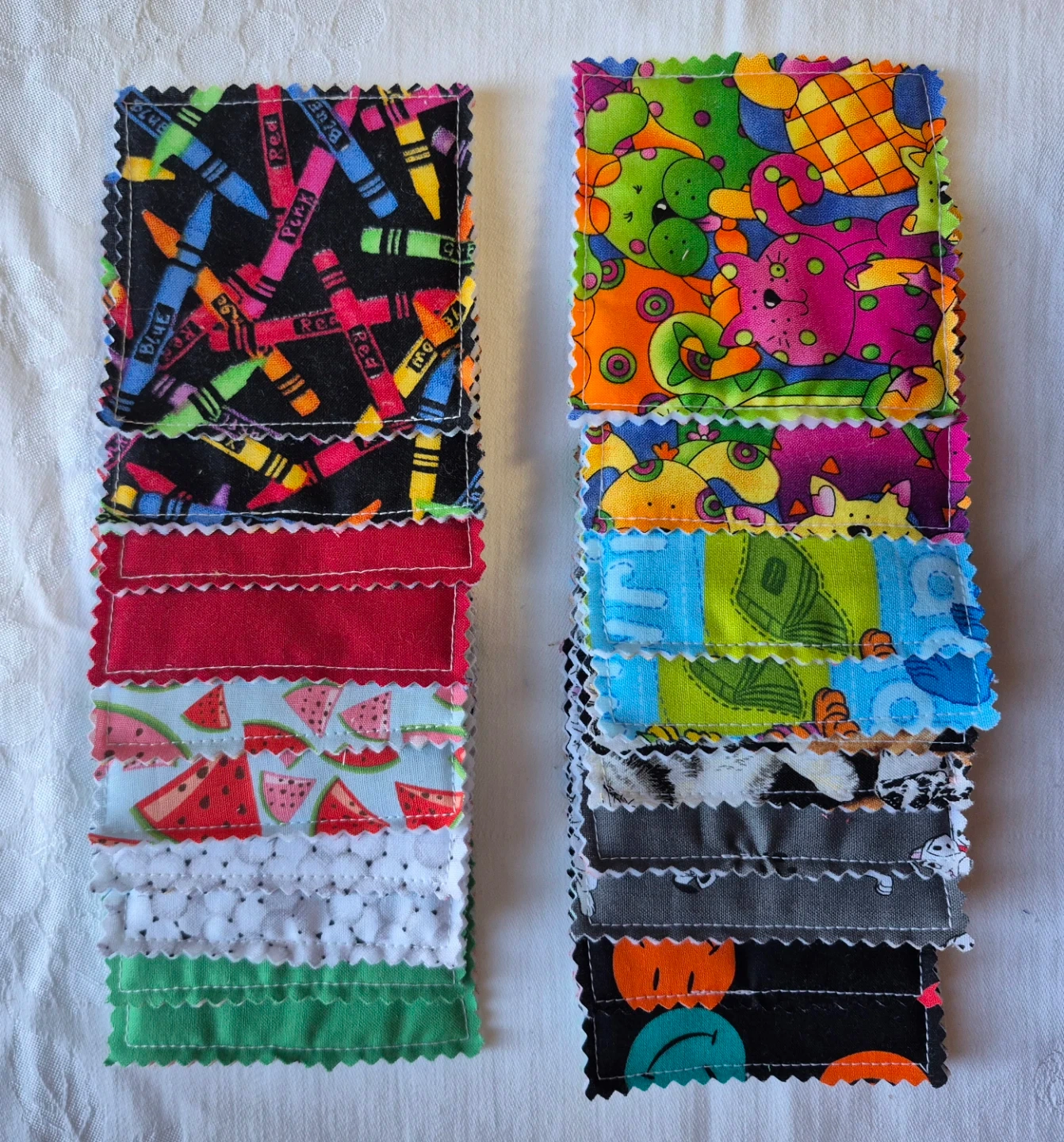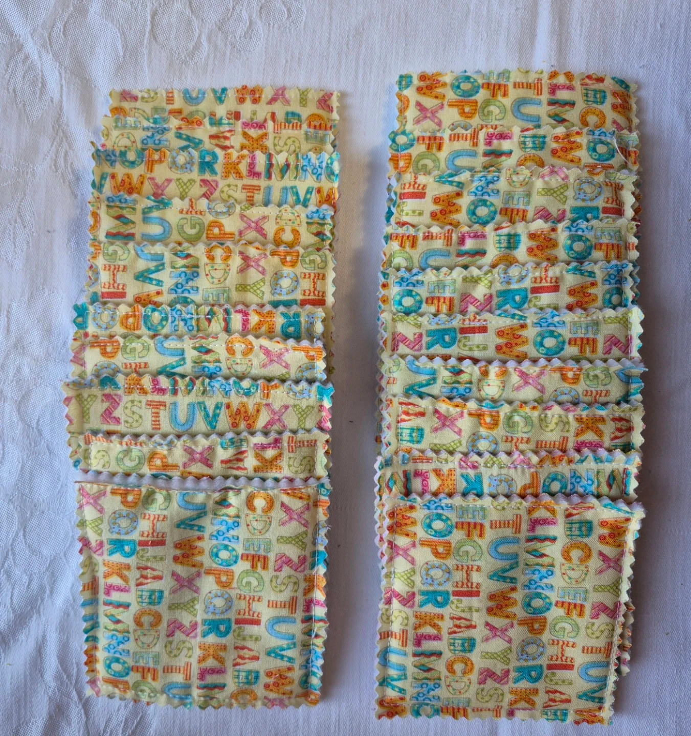 Fabric pieces with no sharp edges, washable and it has its only storage bag. Each bag holds 10 sets, 20 pieces. 100 % cotton, cards measure 3.5 in x 3.5in, bag measures 6in x 10in. Same print on one side and 2 of each print on other side.