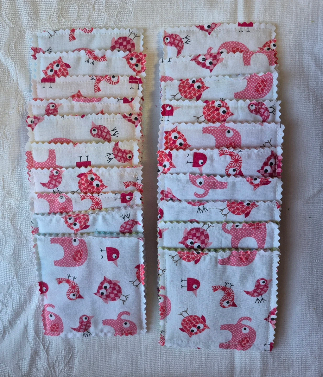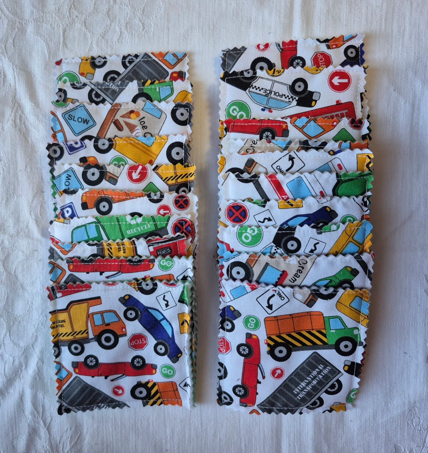 Fabric pieces with no sharp edges, washable and it has its only storage bag. Each bag holds 10 sets, 20 pieces. 100 % cotton, cards measure 3.5 in x 3.5in, bag measures 6in x 10in. Same print on one side and 2 of each print on other side.