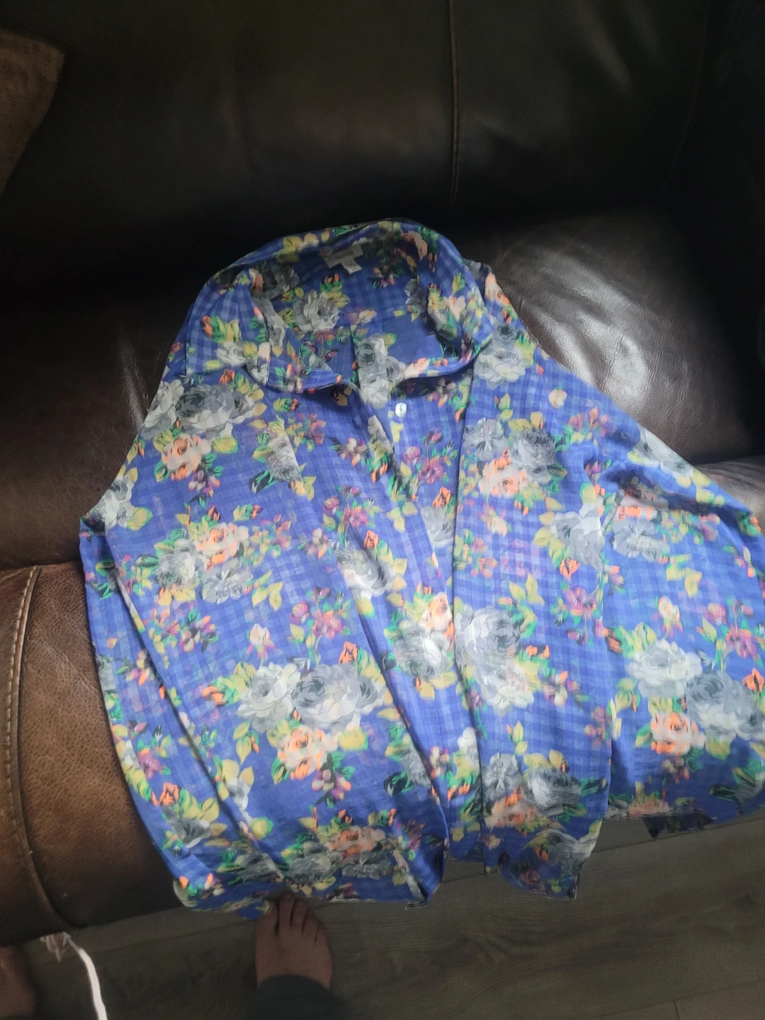 Blue button-up blouse with a floral print. It's made of a lightweight material. This top would be great for spring or summer!