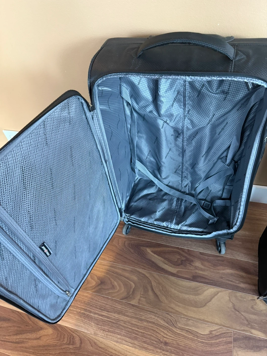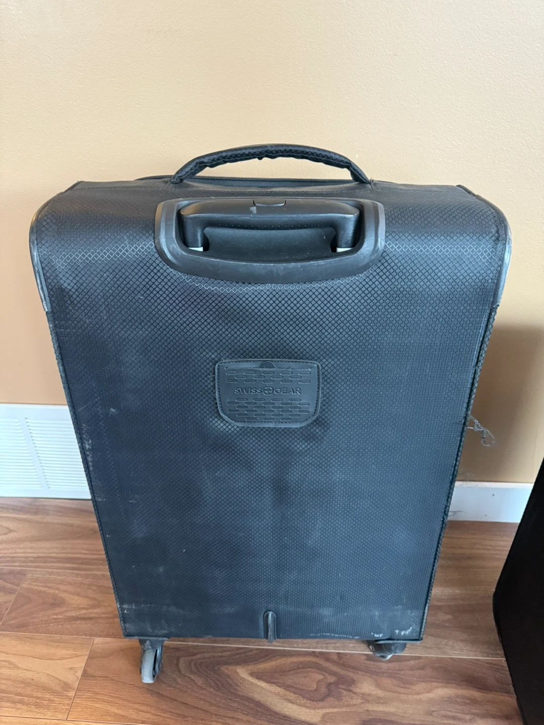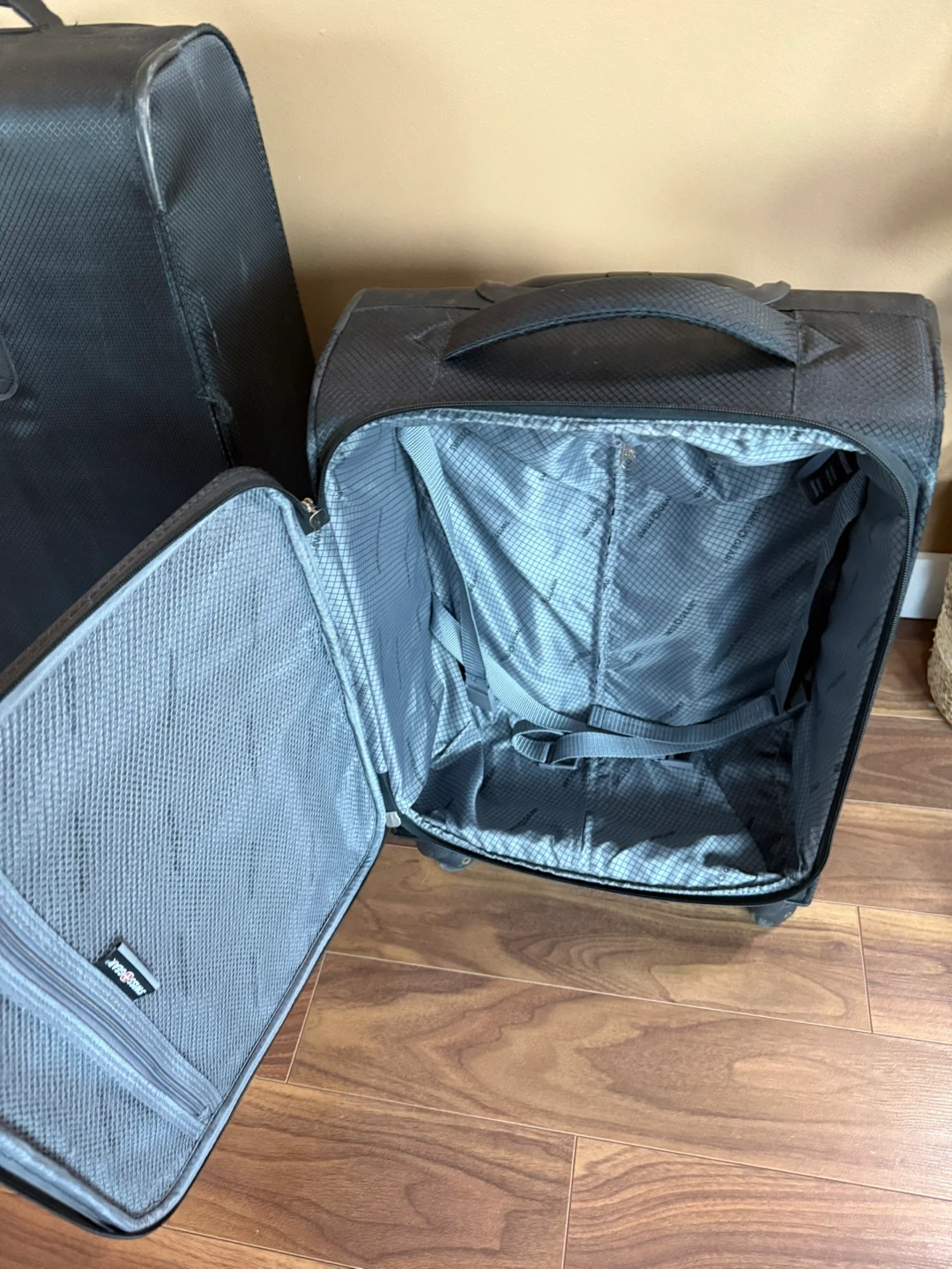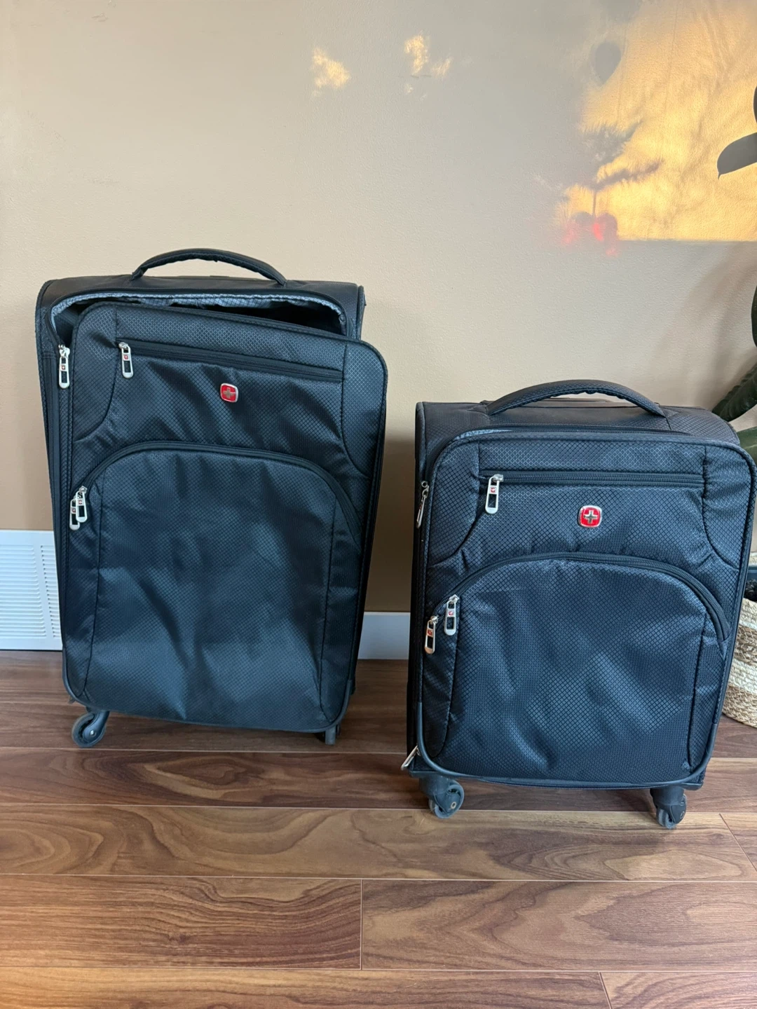 Set of two Swiss gear soft sided luggage with spinner wheels. Checked bag has some wear but carry-on is in perfect condition.