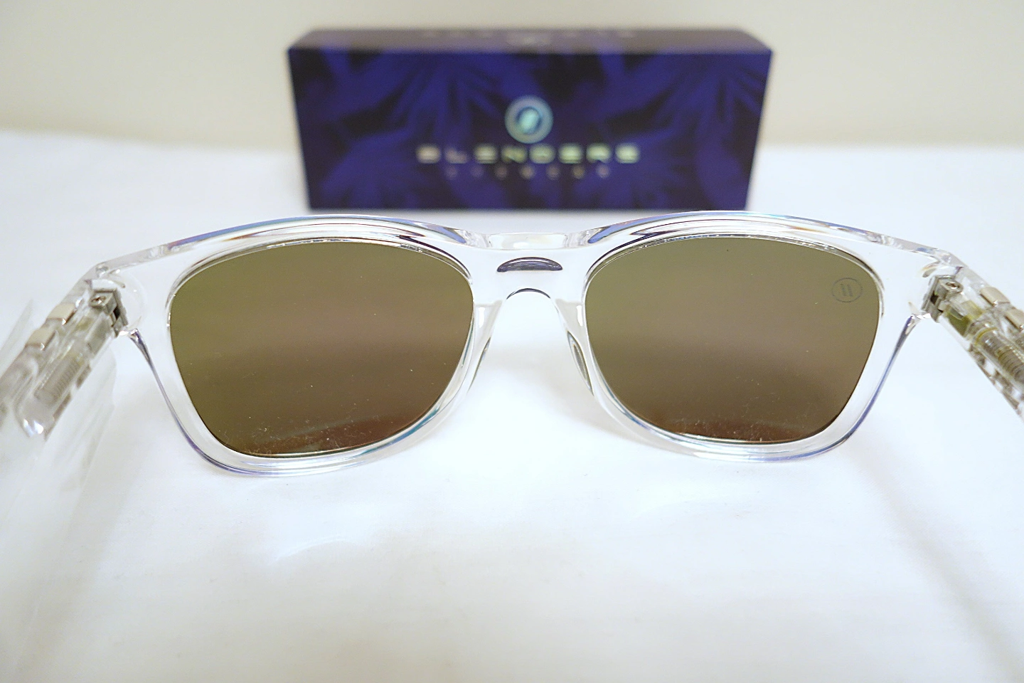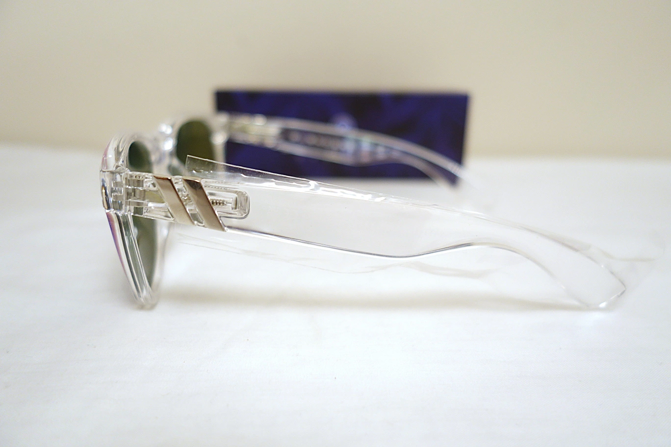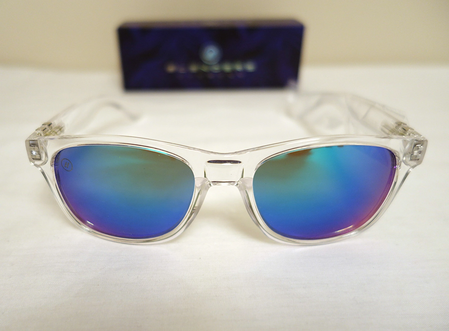 Clear frame sunglasses. Spring hinged arms. Mirrored polarized lenses that appear green or blue depending on the angle. Includes case and box and 2 in 1 soft storage/cleaning pouch.