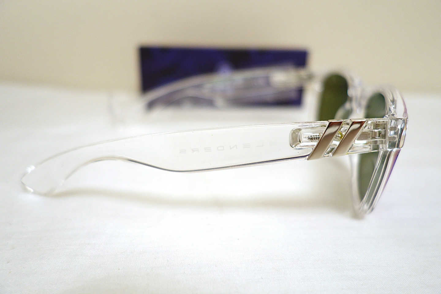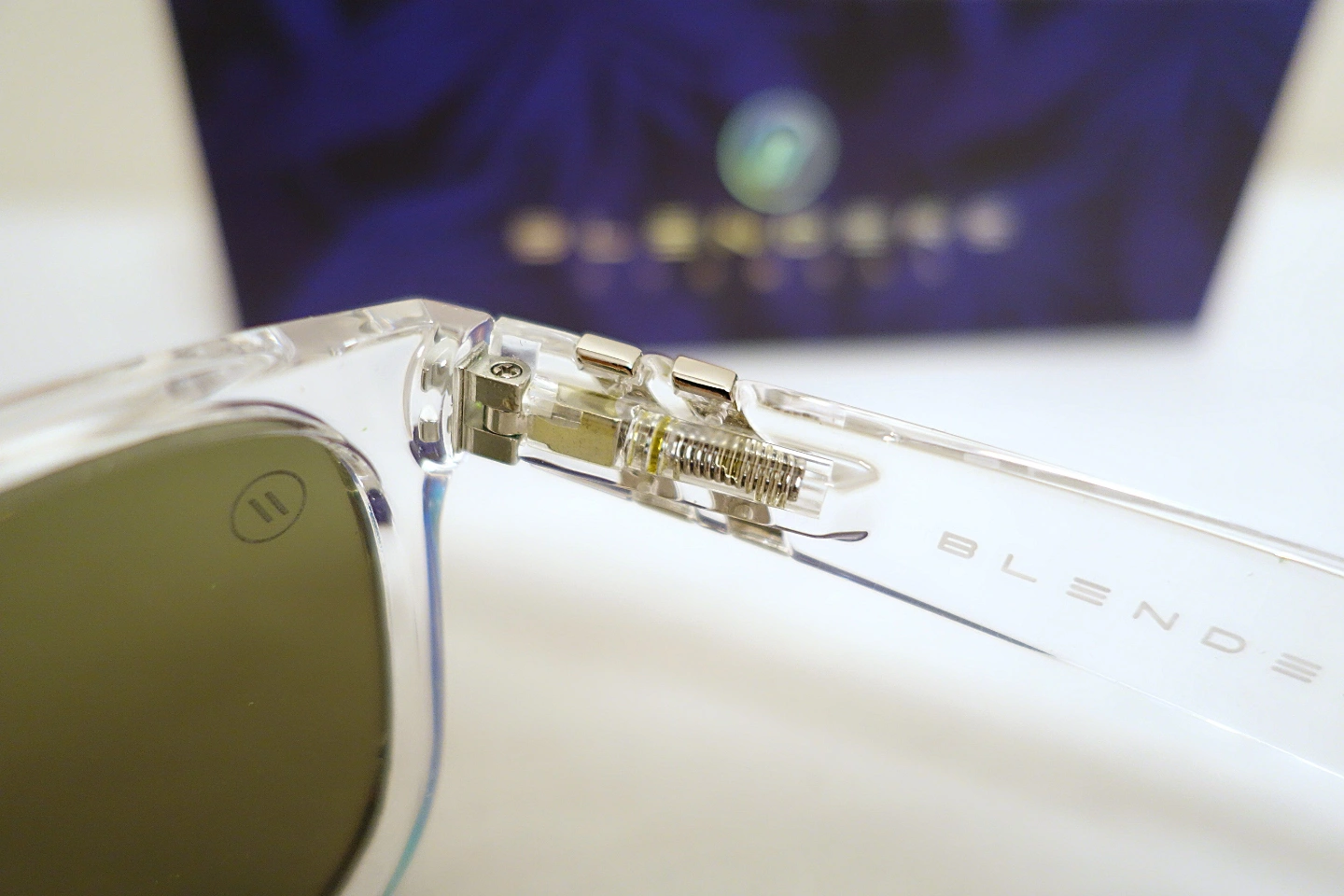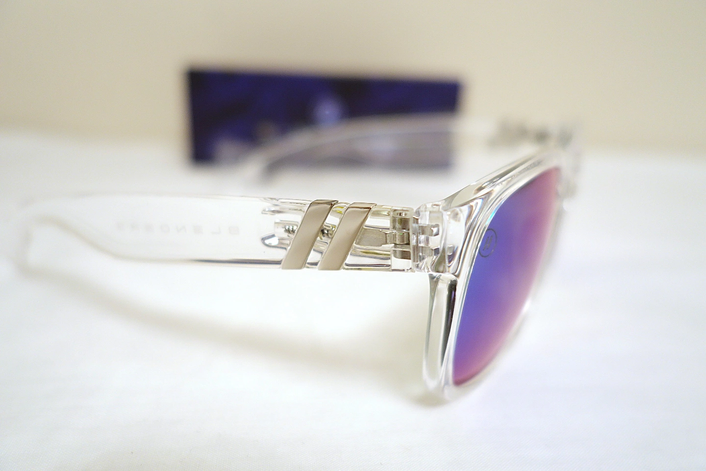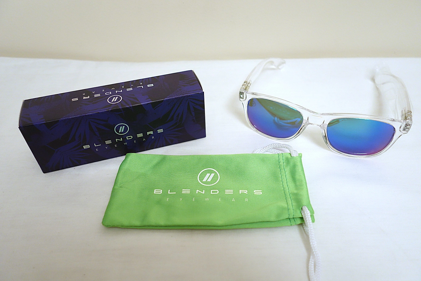 Clear frame sunglasses. Spring hinged arms. Mirrored polarized lenses that appear green or blue depending on the angle. Includes case and box and 2 in 1 soft storage/cleaning pouch.