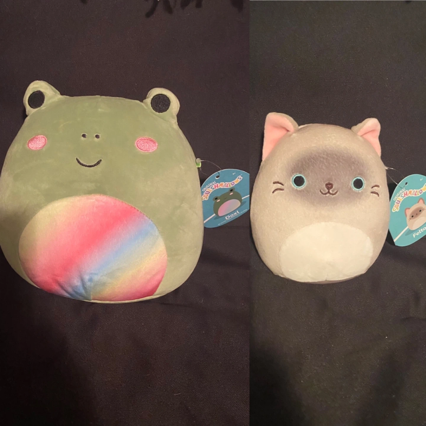 Selling a set of 2 Squishmallows Frog and Cat plush toys. The frog Doxl is approx 7.5” tall and the cat Felton approx 4-5” tall.