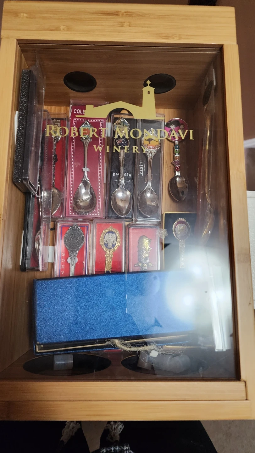 A bamboo display case filled with various collectible souvenir spoons. It includes spoons from different locations like Colombia, Malaysia, Japan, and more. Spoons are in individual packaging or presentation boxes.