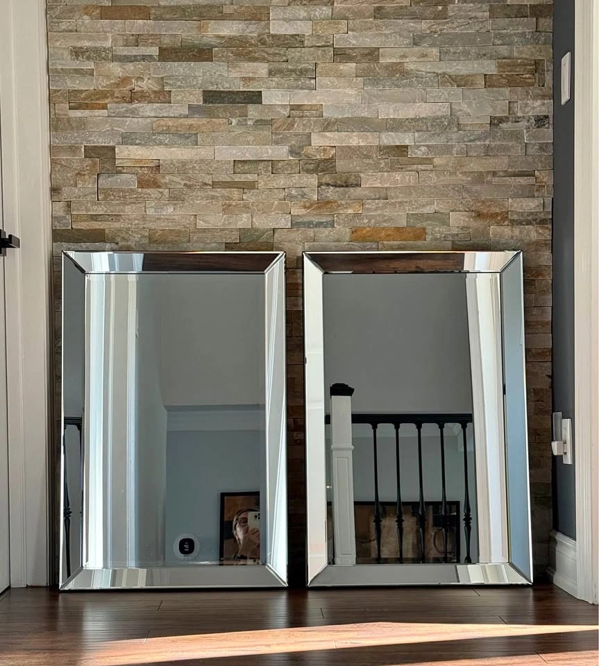 Two cristal mirrors in great condition. Great for bathroom, powder room, bedroom or hair salon. Sells as a set preferably. Cristal Clear view and no damages. 91cm X 60,5 cm. Two hooks on the back to mount on the wall. Pick up offer. $50 each mirror. Firm price.