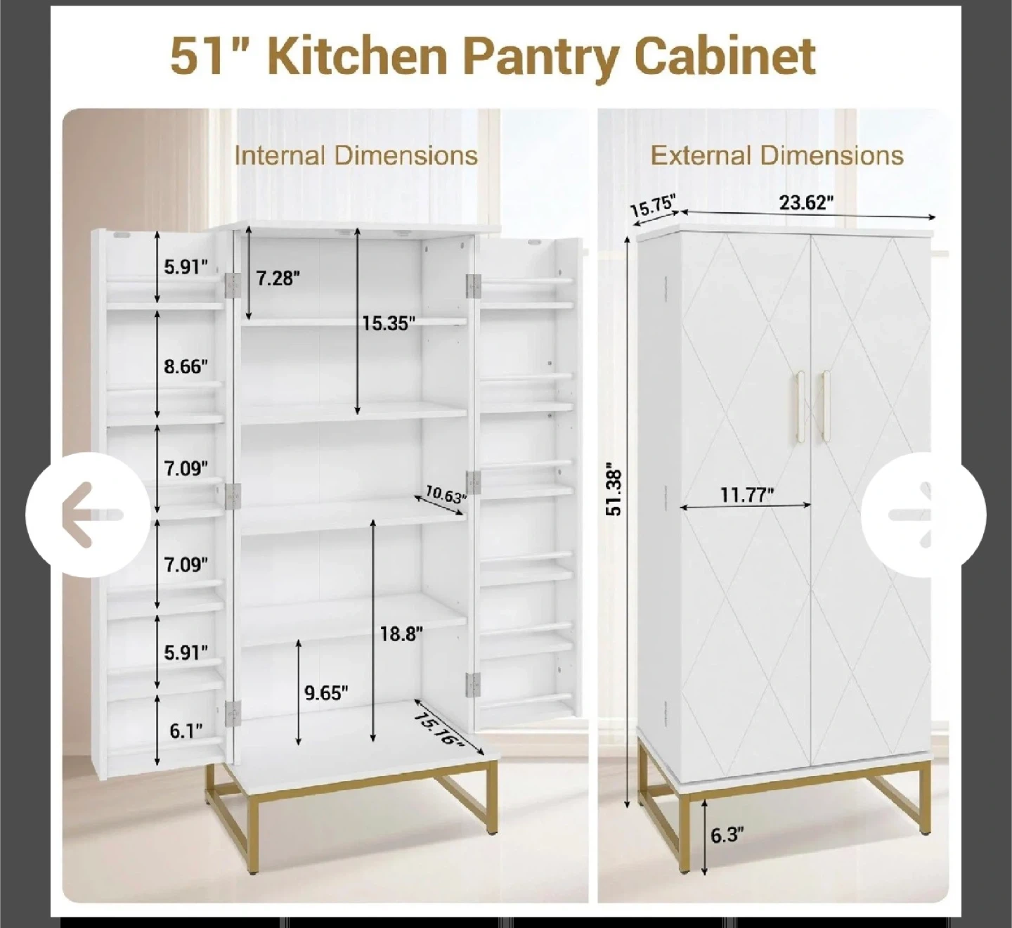A 51-inch tall kitchen pantry cabinet in white with a diamond-patterned door design and gold accents. It features adjustable shelves with three layers of adjustment for flexible storage. External dimensions are 23.62" W x 15.75" D x 51.38" H.