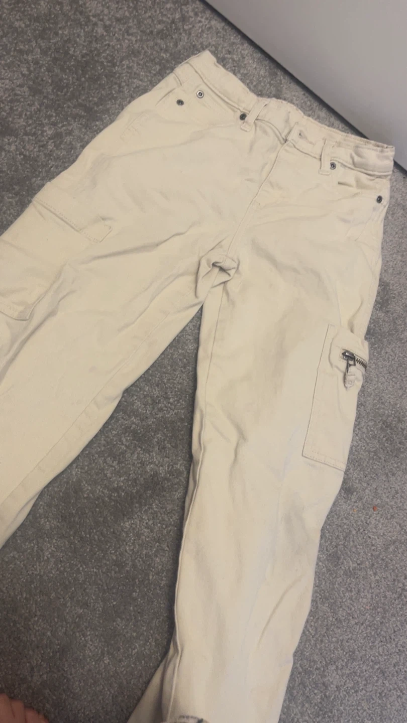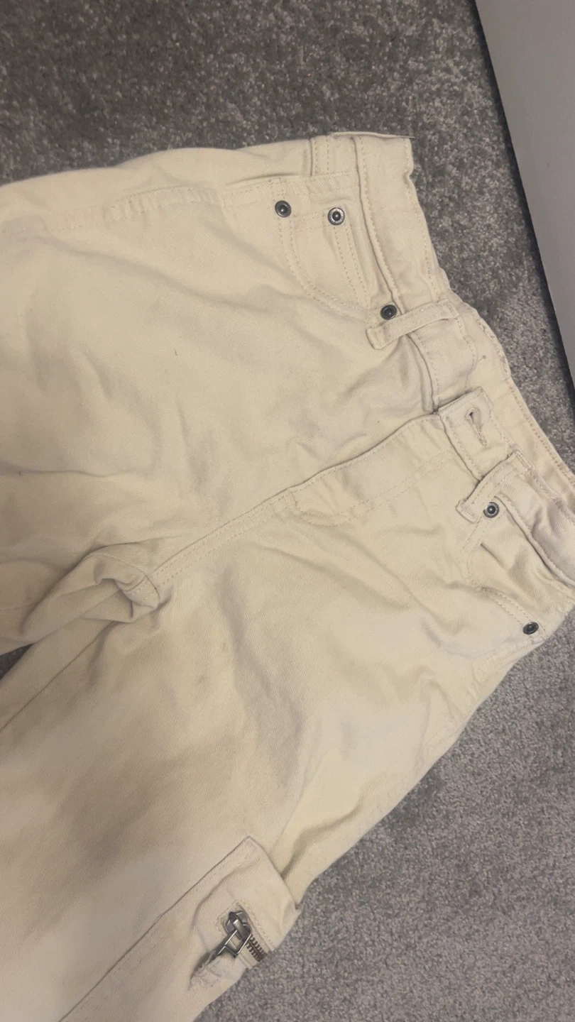 Cream coloured cargo pants from George Apparel. Made with 97% cotton and 3% spandex. These pants are a size 12. Features zippered pockets on the sides.
