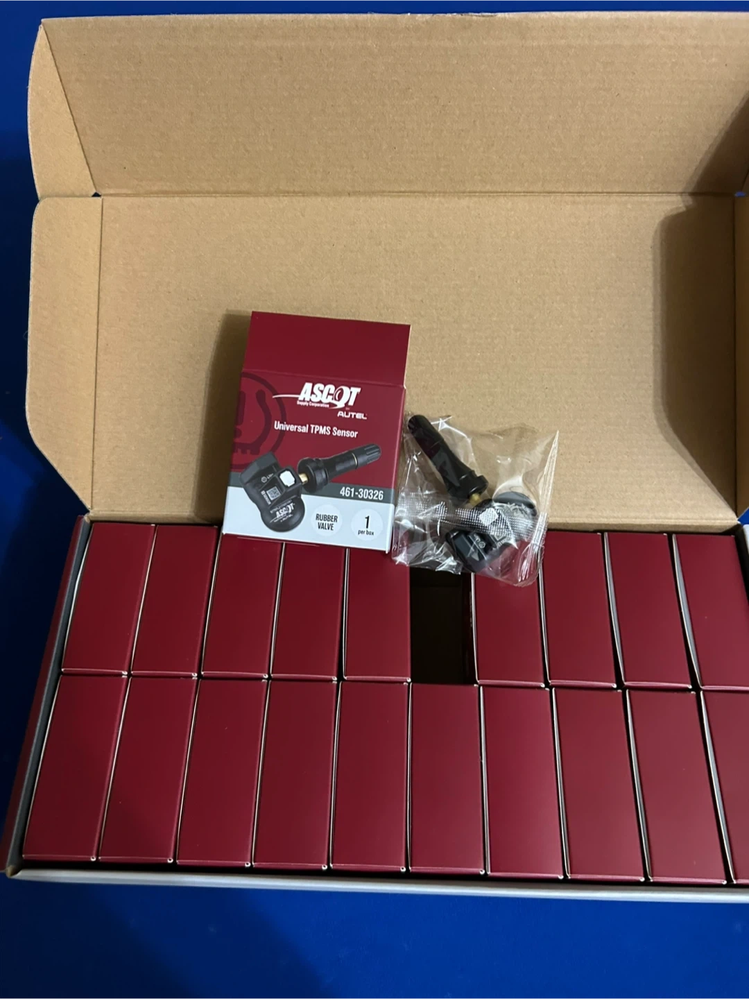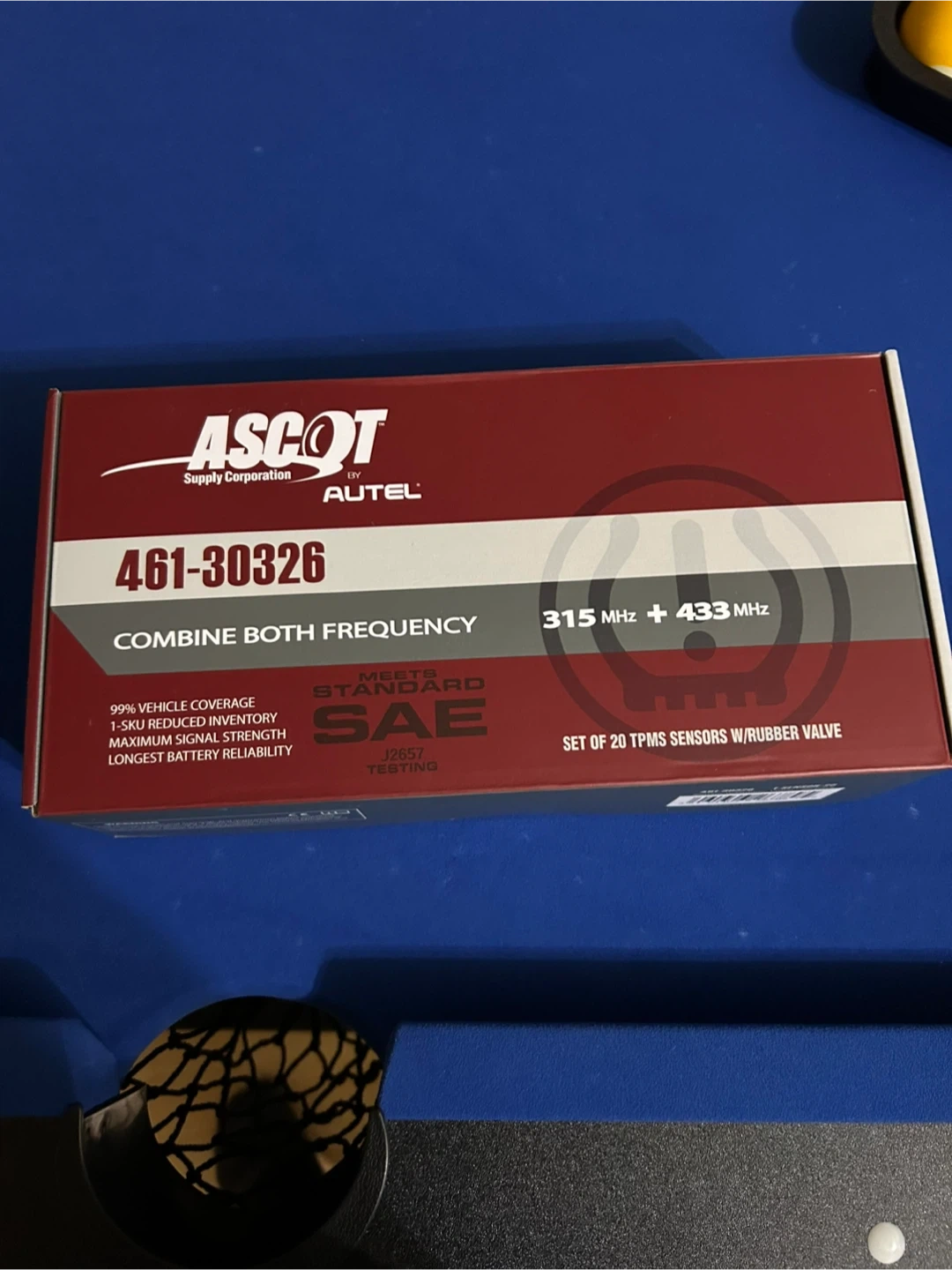 Selling a Ascot TPMS sensor with rubber valve. These are universal TPMS sensors, part number 461-30326, that combine both 315 MHz and 433 MHz frequencies. They feature 99% vehicle coverage, reduced inventory, maximum signal strength, and longest battery reliability. Meets SAE standards. Installed is available with extra fee.