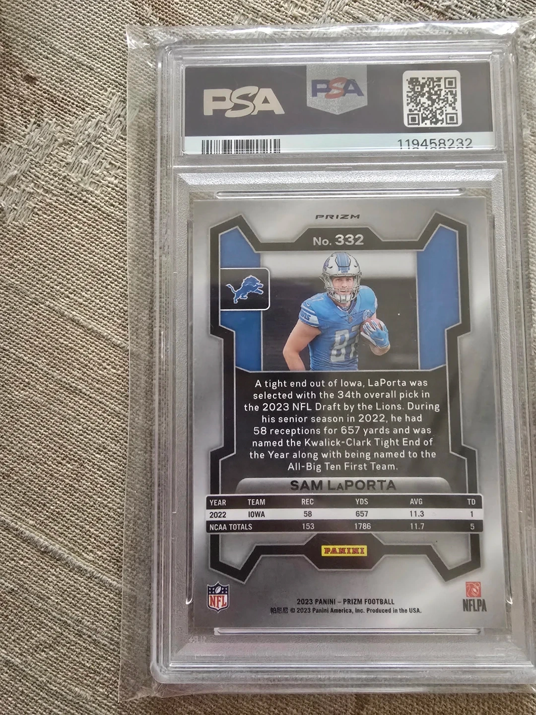 This is a 2023 Prizm Sam LaPorta card, serial number #332. It's a Lazer Prizm variant and has a Gem Mint 10 grade from PSA. The card features the Detroit Lions player. It's a valuable addition for any football card collector!