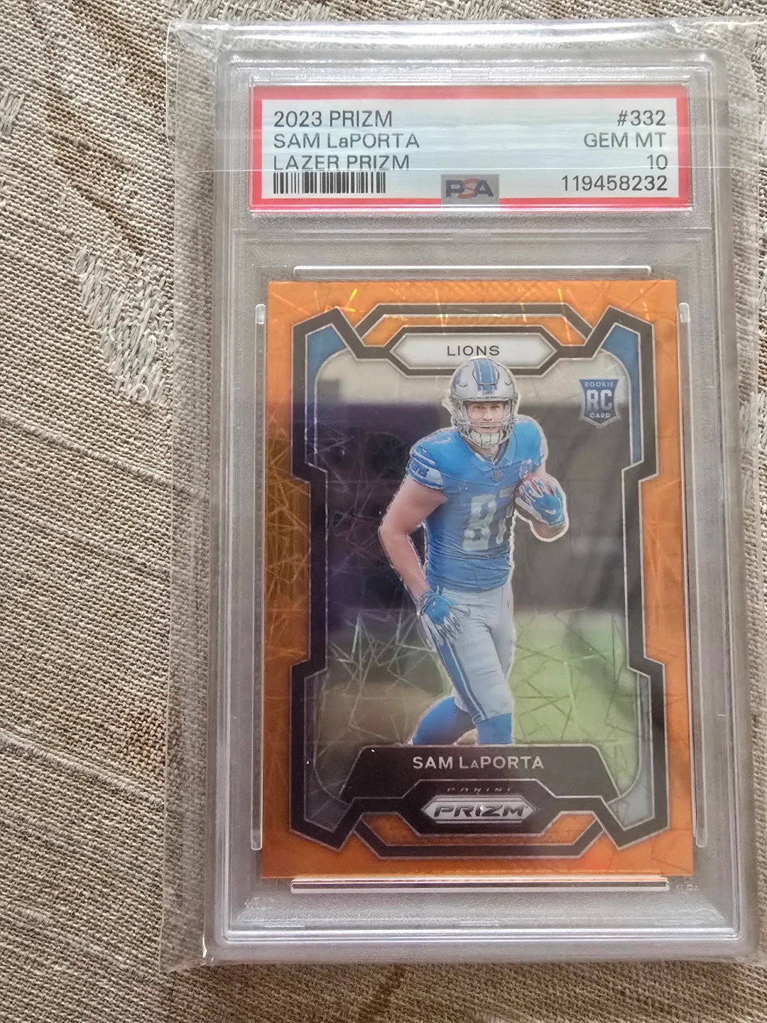 This is a 2023 Prizm Sam LaPorta card, serial number #332. It's a Lazer Prizm variant and has a Gem Mint 10 grade from PSA. The card features the Detroit Lions player. It's a valuable addition for any football card collector!