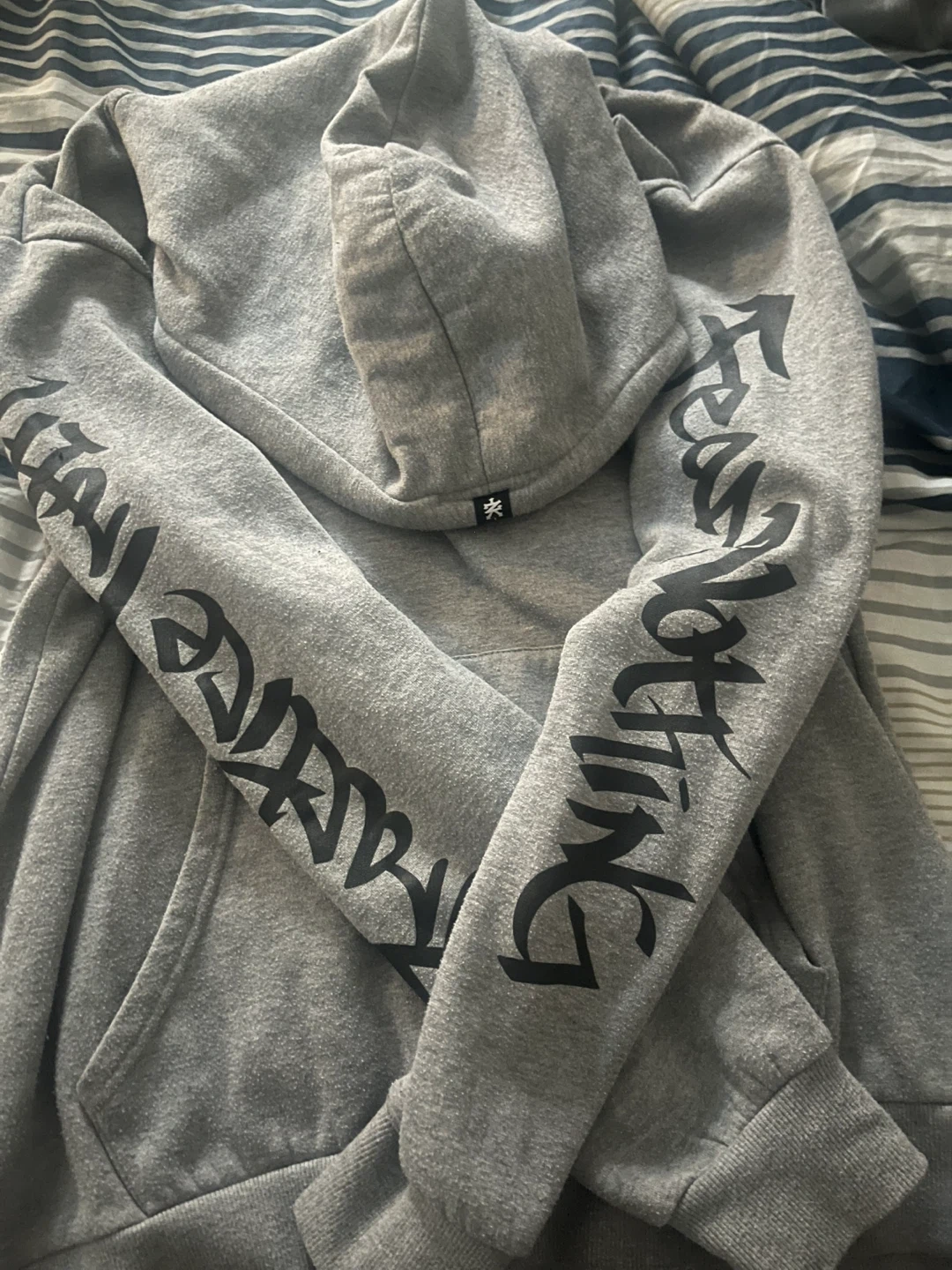 This grey Zoo York hoodie features graphic text on the sleeves and a front pocket. It's a size L/G. Great for casual wear!