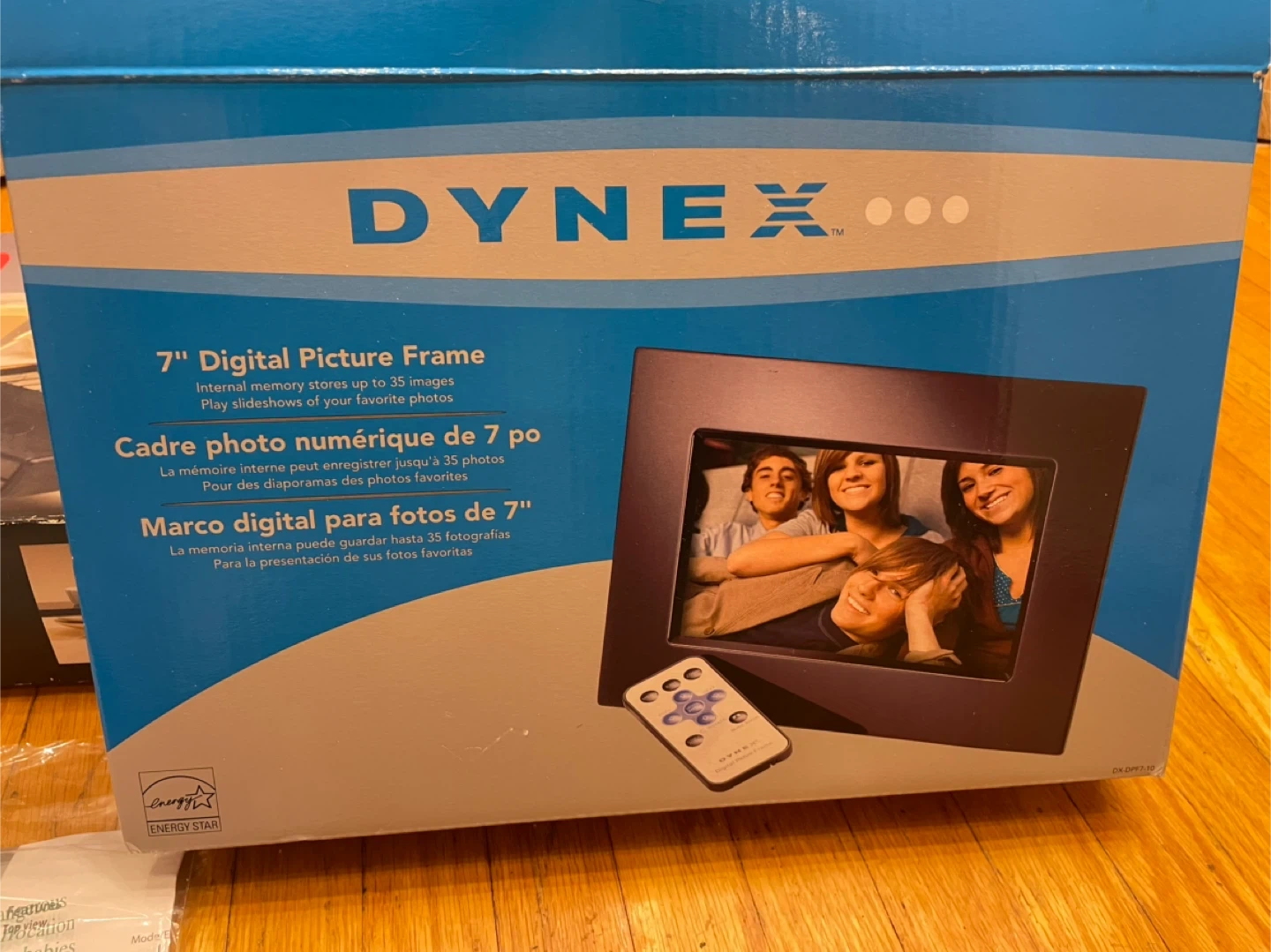 This is a Dynex 7-inch digital picture frame. It's black and can store up to 35 images internally. The frame supports both landscape and portrait placement with its included desktop stand. You can easily display your favorite photos!