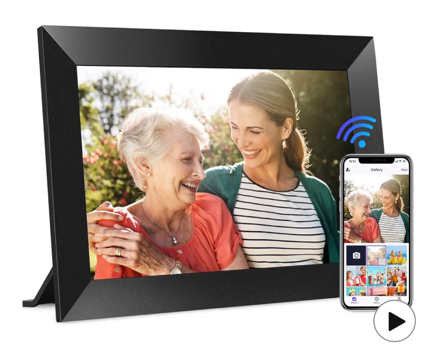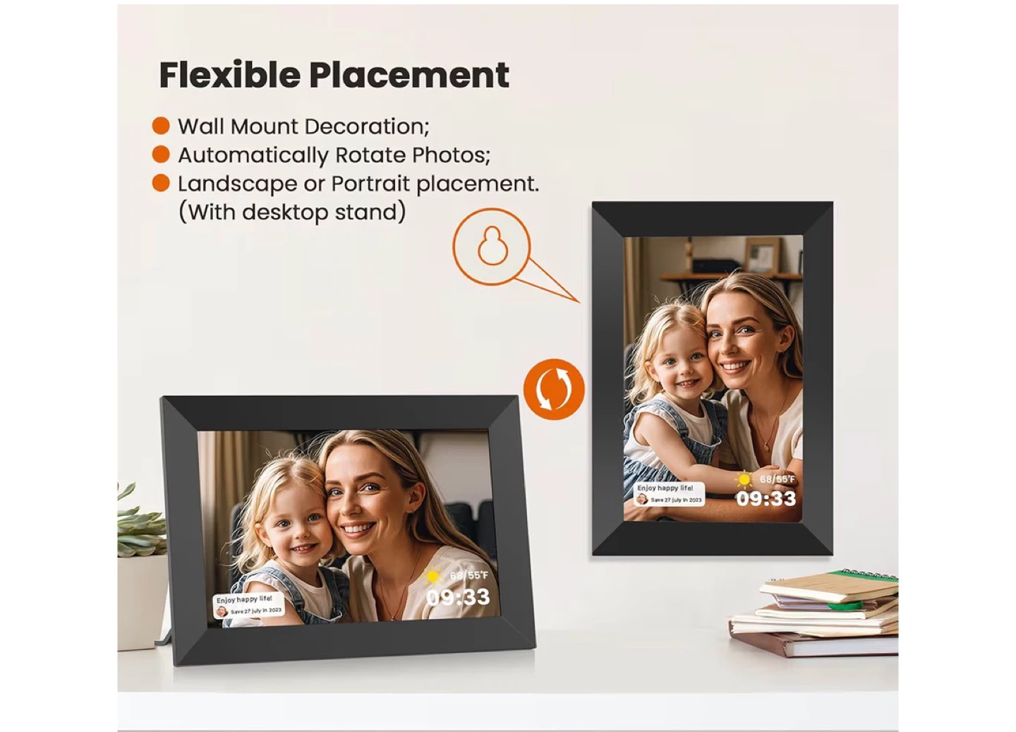 This is a Dynex 7-inch digital picture frame. It's black and can store up to 35 images internally. The frame supports both landscape and portrait placement with its included desktop stand. You can easily display your favorite photos!