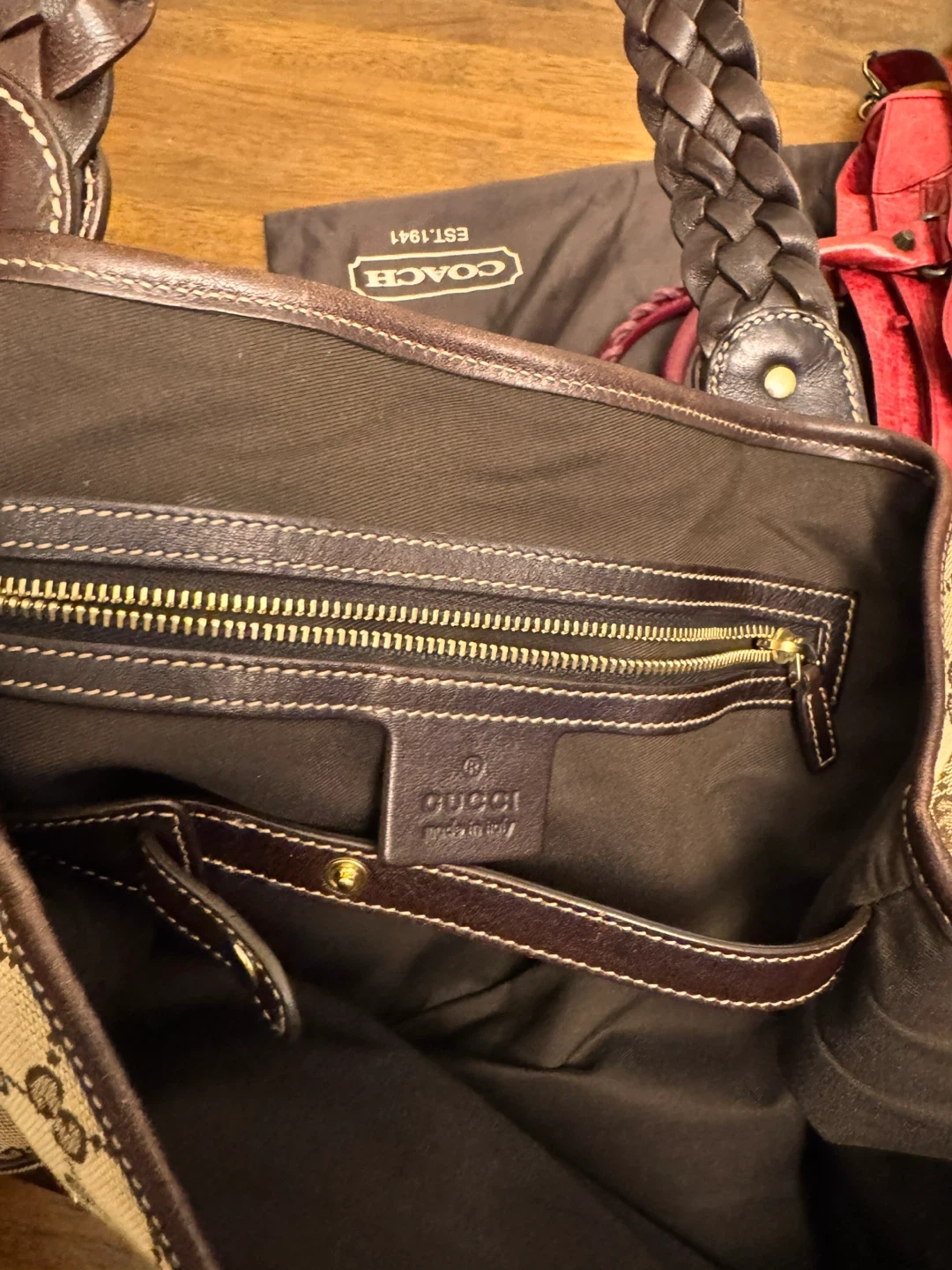 Classic Gucci shoulder bag in monogram canvas with leather trim. This bag features a spacious interior and a zippered pocket. It's a stylish accessory for everyday use. Includes dust bag.