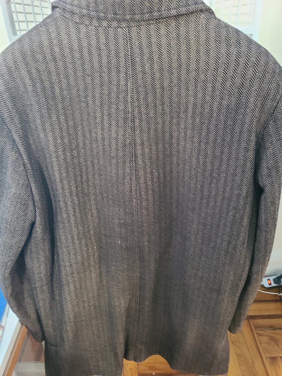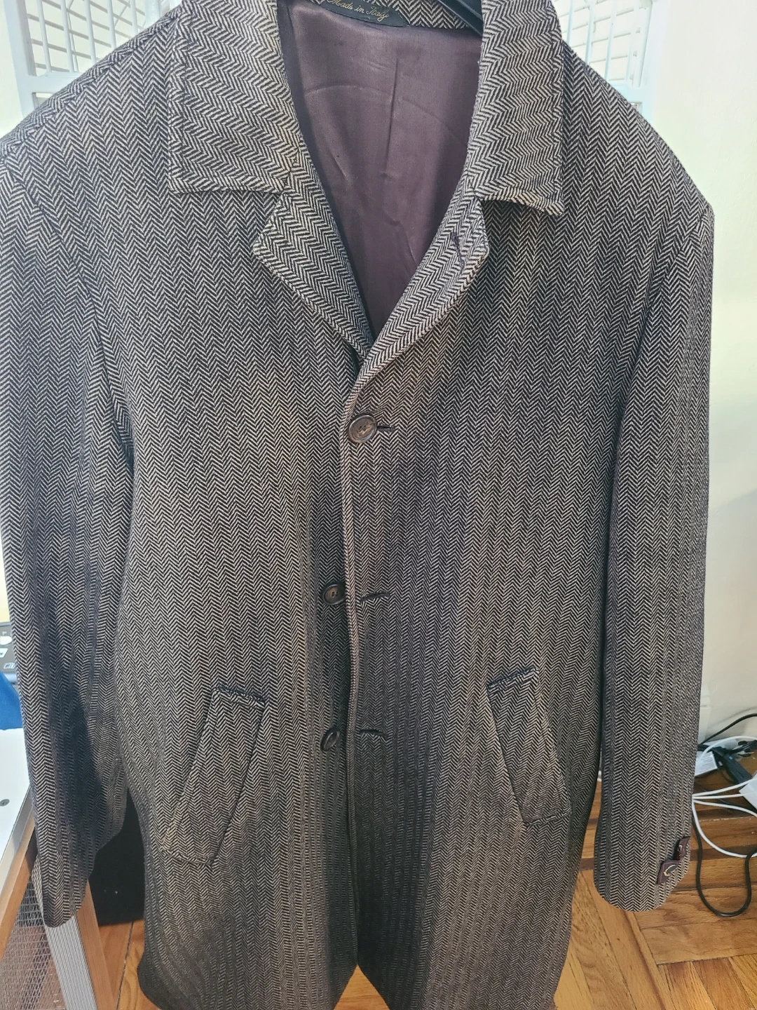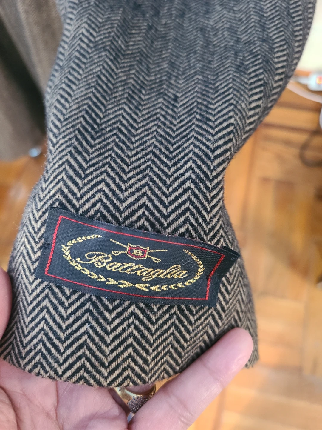 This is a Battaglia men's 100% italian wool coat. It features a herringbone pattern and button closure. Made from wool and polyester inner material.