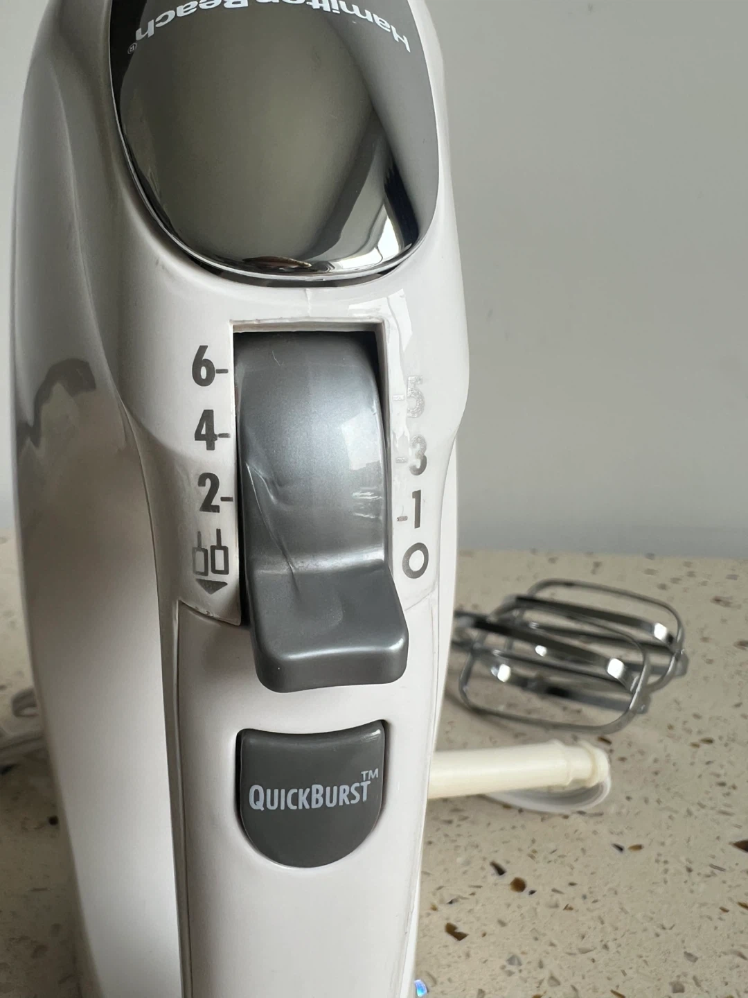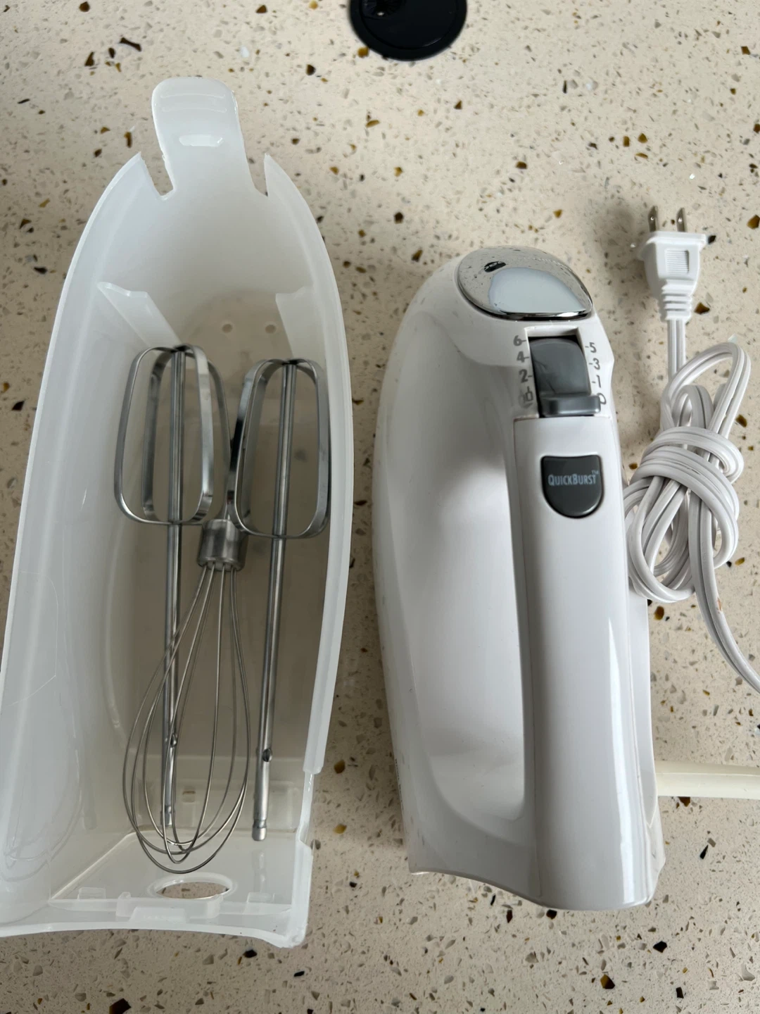 White Hamilton Beach hand mixer. Includes beaters, whisk, and storage case. Features 6 speeds and a QuickBurst button.