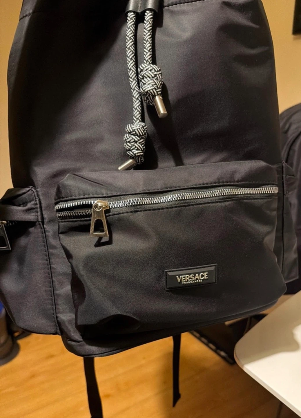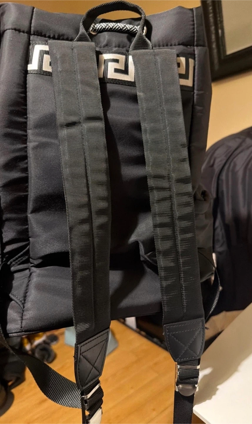 This black nylon backpack features the iconic Versace Greek key pattern on the straps. It has multiple zippered pockets for organization and a drawstring closure.