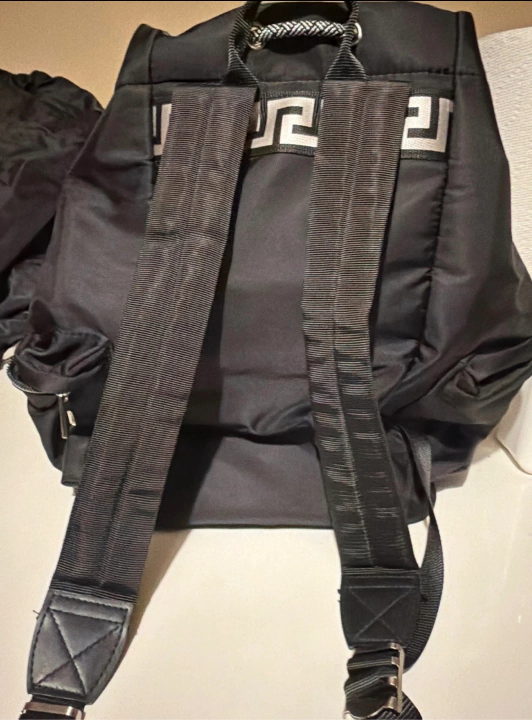 This black nylon backpack features the iconic Versace Greek key pattern on the straps. It has multiple zippered pockets for organization and a drawstring closure.