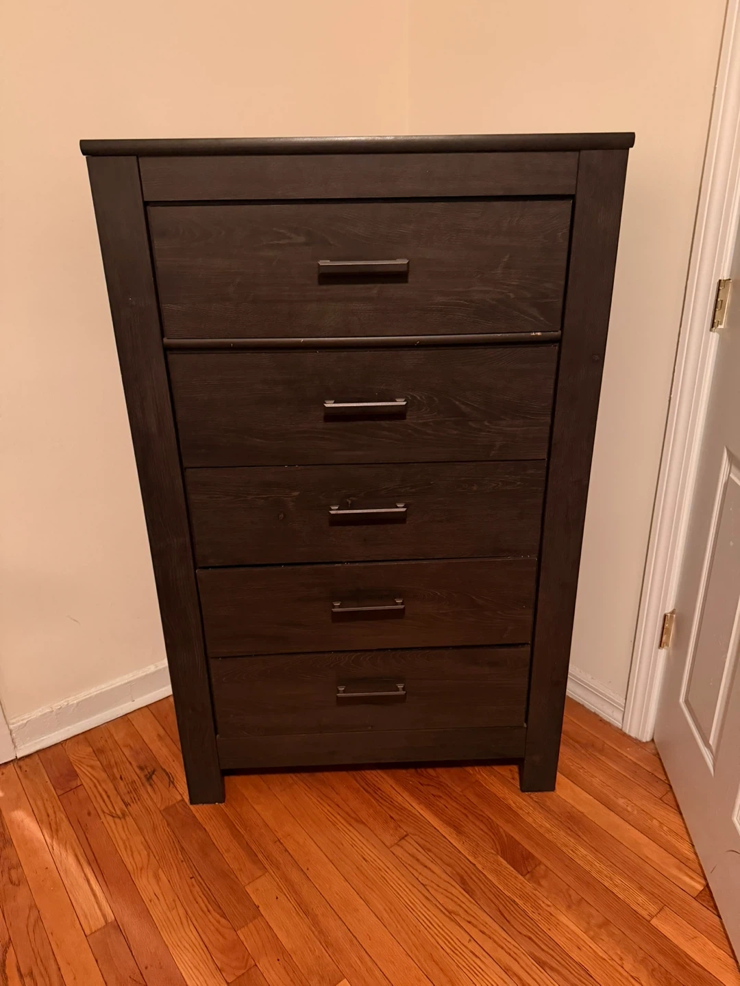 This dark wood dresser features five drawers for ample storage. It's a sturdy piece with a modern design. The drawer pulls are a brushed nickel finish.