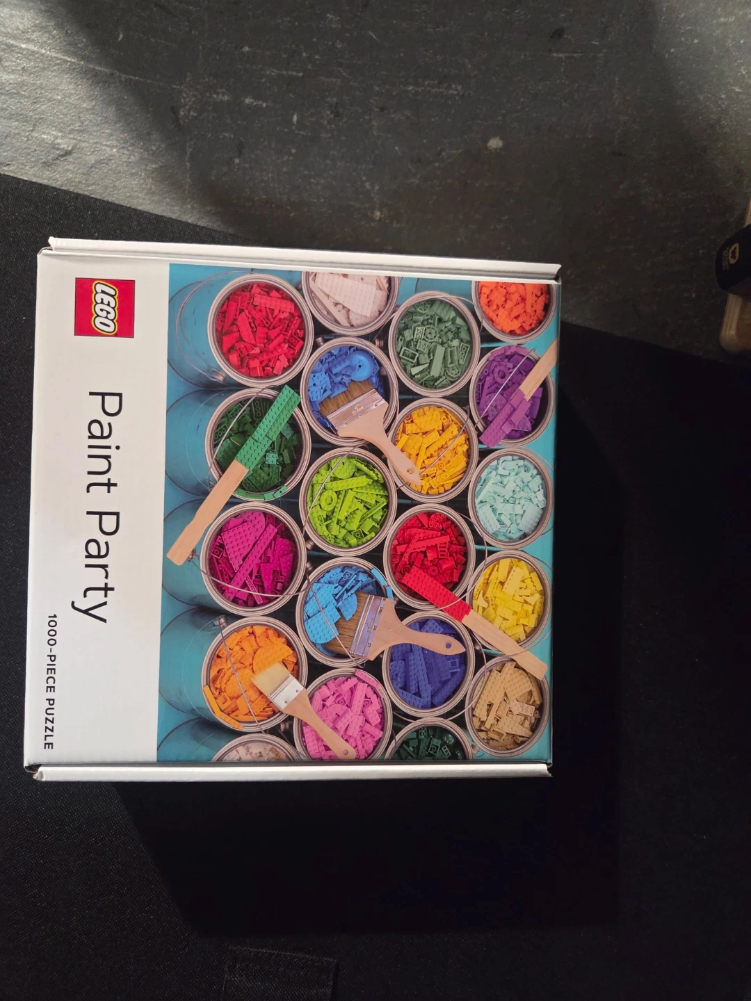 This is the LEGO Paint Party 1000-piece puzzle. It features a colourful design of paint cans filled with LEGO bricks. A fun puzzle for LEGO fans!