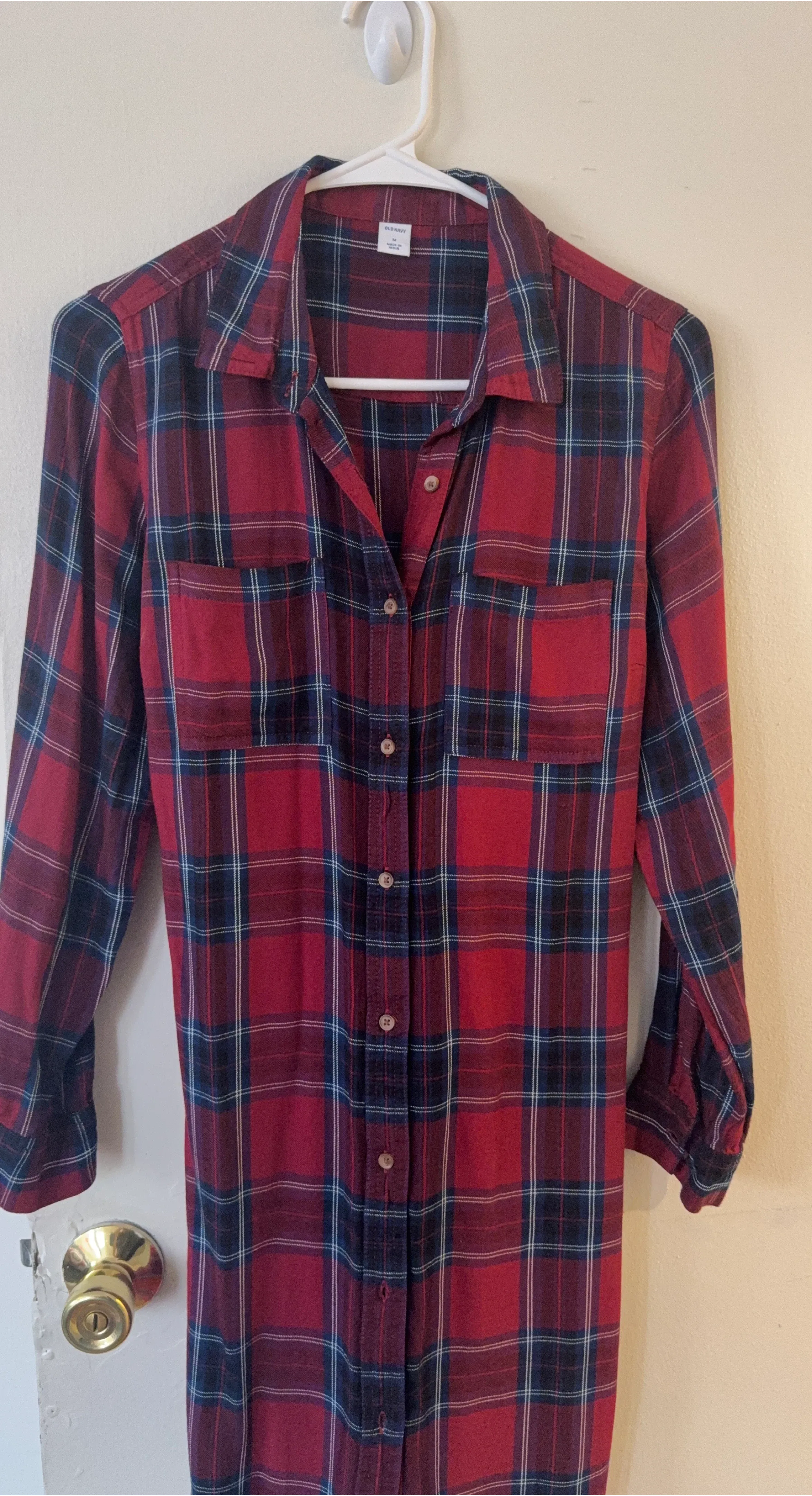 This Old Navy shirt dress features a classic red, blue, and white plaid pattern. It's a long-sleeved, button-up style with two chest pockets. Great for casual wear!