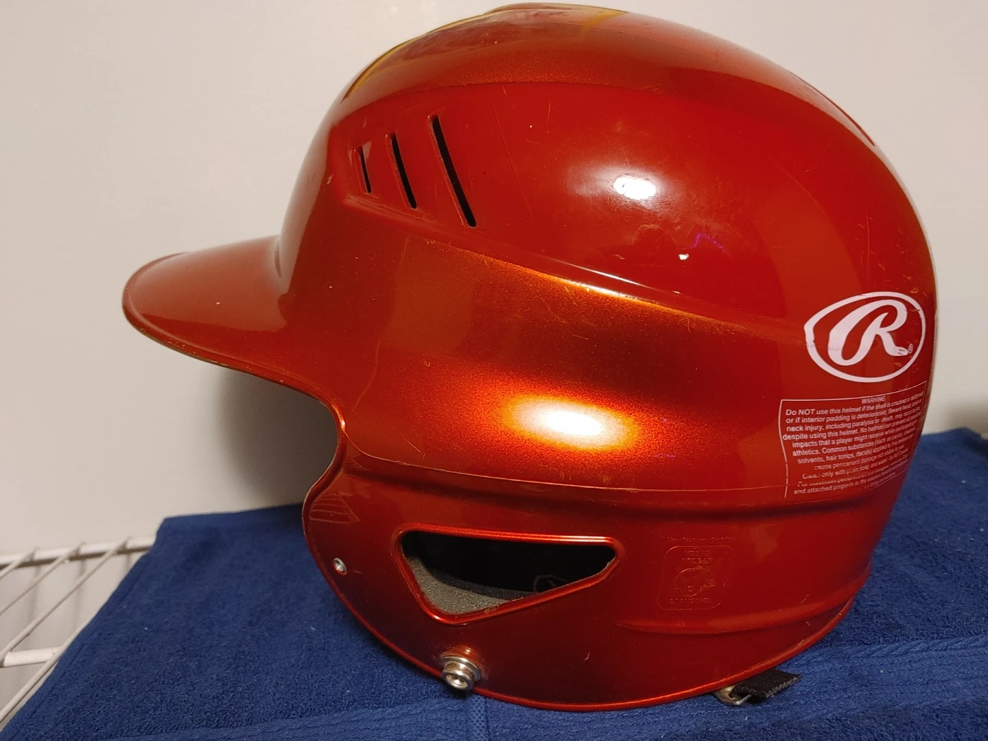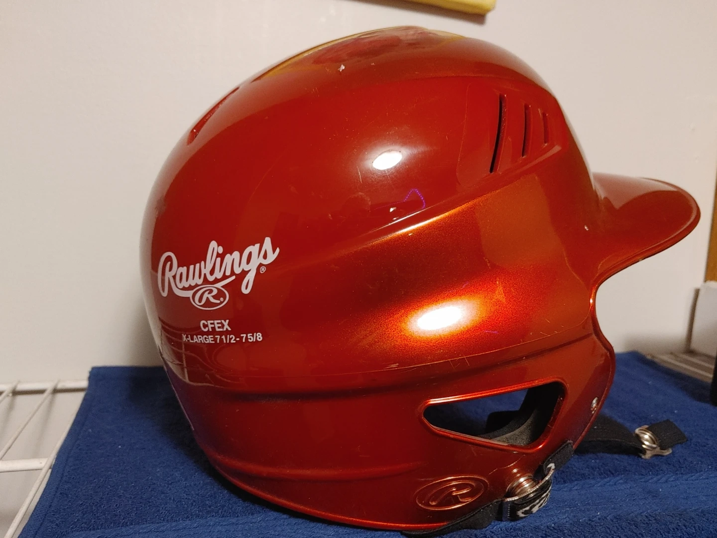 1 season usage. This is a Rawlings CFEX baseball helmet. It's an X-Large size, fitting 7 1/2 to 8.