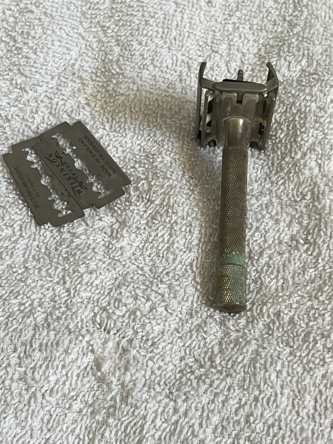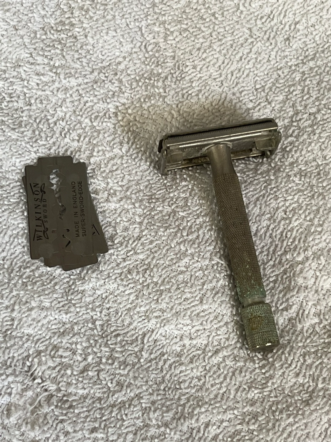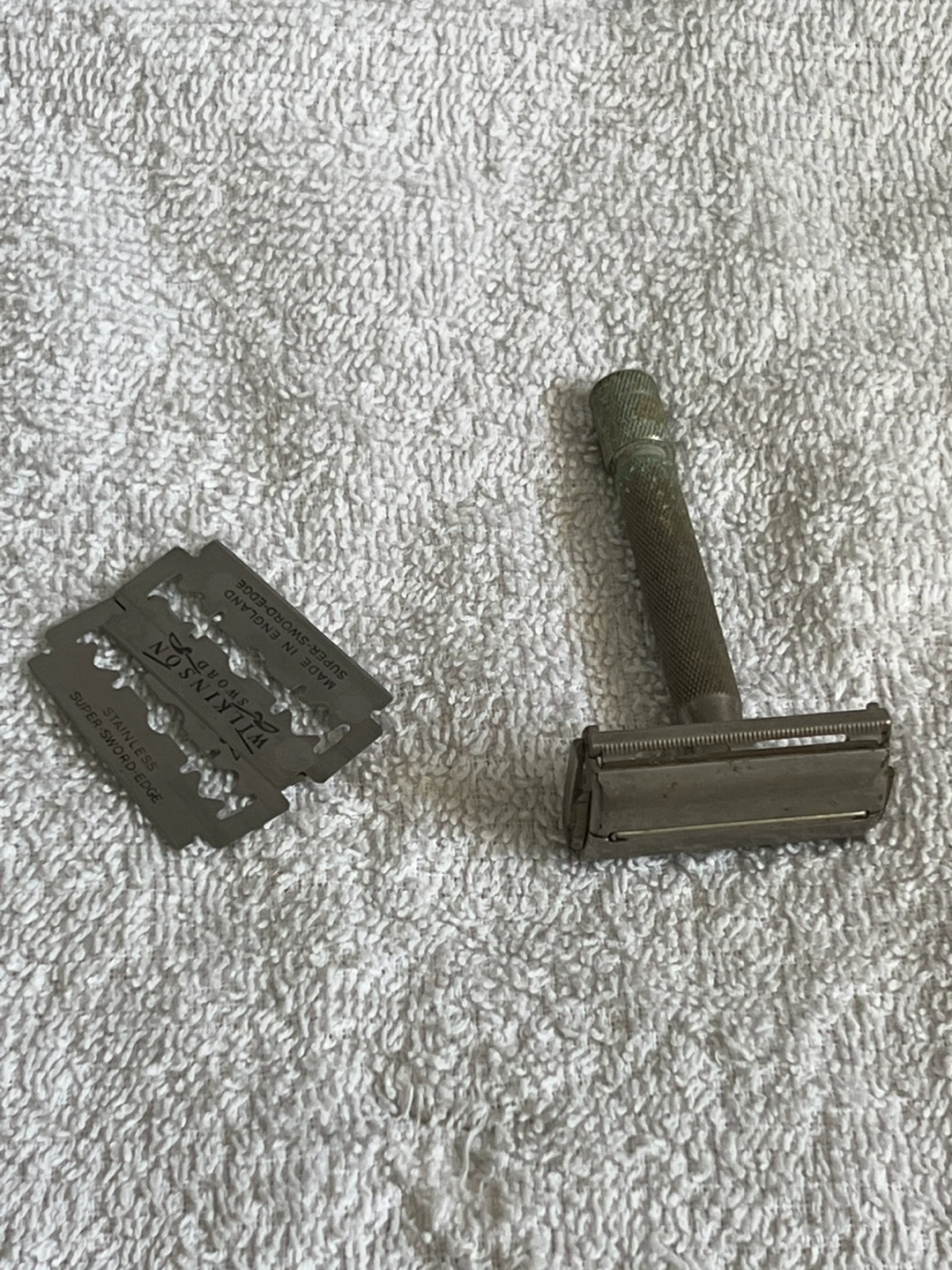 Vintage Wilkinson Sword double-edge safety razor. Includes Wilkinson Sword blades. Metal construction. Shows some signs of age and use.