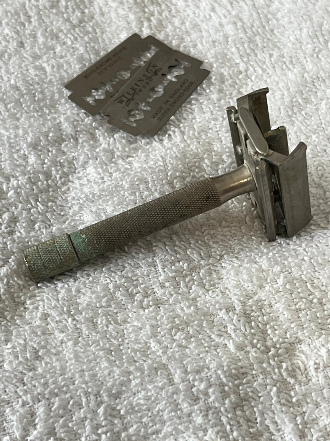 Vintage Wilkinson Sword double-edge safety razor. Includes Wilkinson Sword blades. Metal construction. Shows some signs of age and use.
