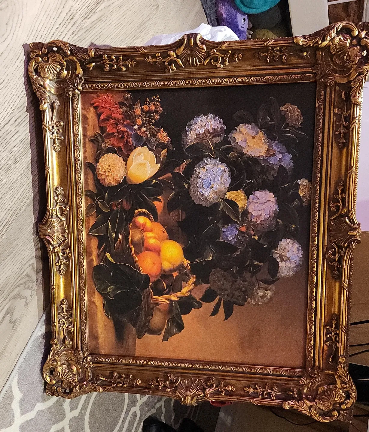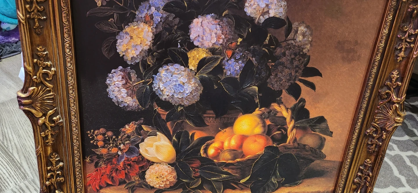 This framed print depicts a beautiful floral and fruit still life. It's encased in an ornate gold-toned frame, adding a classic touch to any room. The painting showcases hydrangeas, tulips, berries, and a basket of fruit. It's ready to hang!