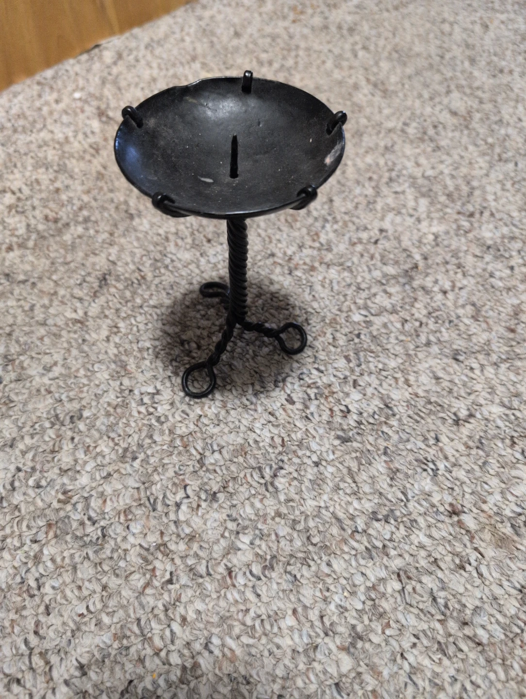 A neat black metal candlestick holder with a twisted stem. It's designed to hold a single 3" candle securely. This holder is great for adding a touch of ambiance to any space! 6" high