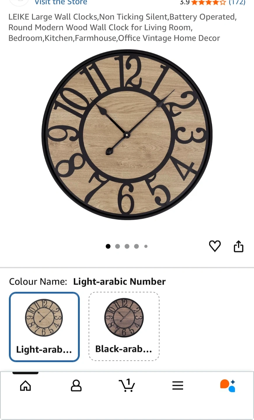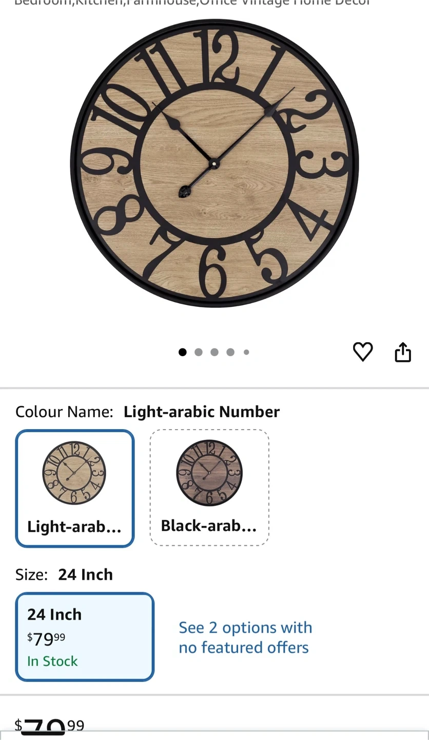 This is a LEIKE 24 inch wall clock with a light arabic number design. It's battery operated and non-ticking, making it great for any room. The clock features a wood-look face and a black frame.