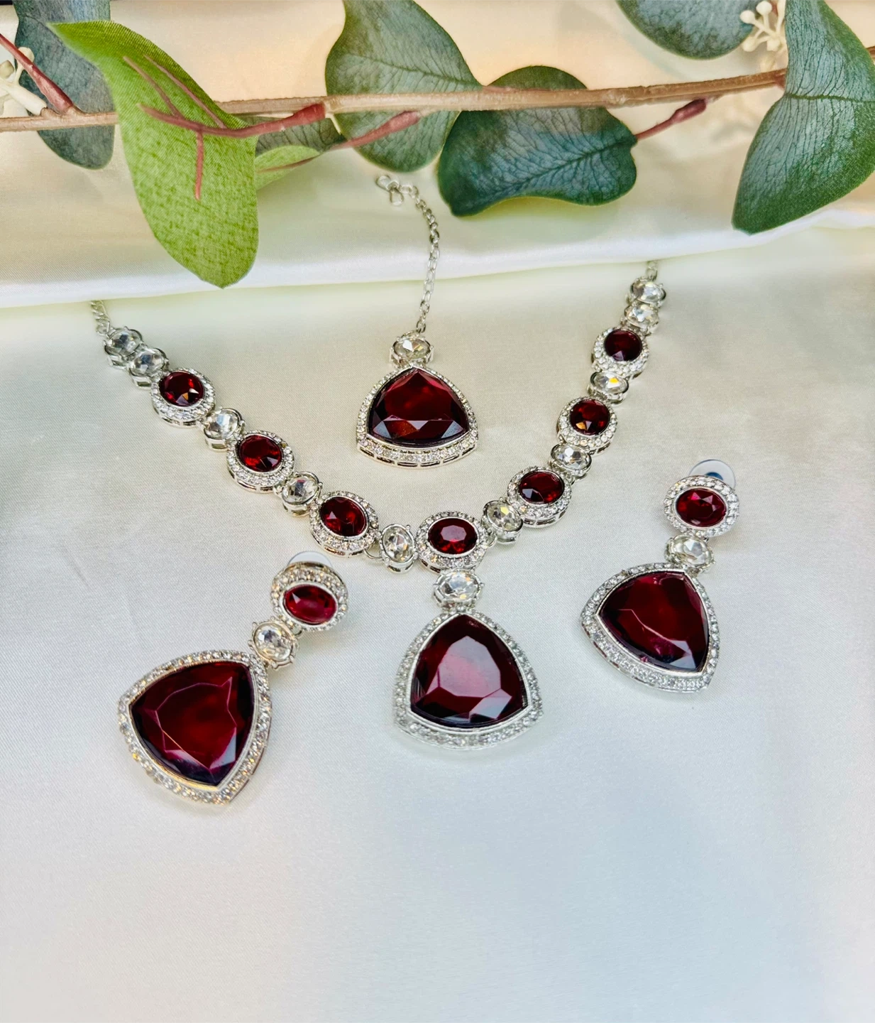 Beautiful 3-piece jewellery set featuring a necklace, drop earrings, and a tikka. Each piece is adorned with deep red triangular gemstones and clear crystals, set in silver-toned metal. It's perfect for adding a touch of elegance to special occasions.
