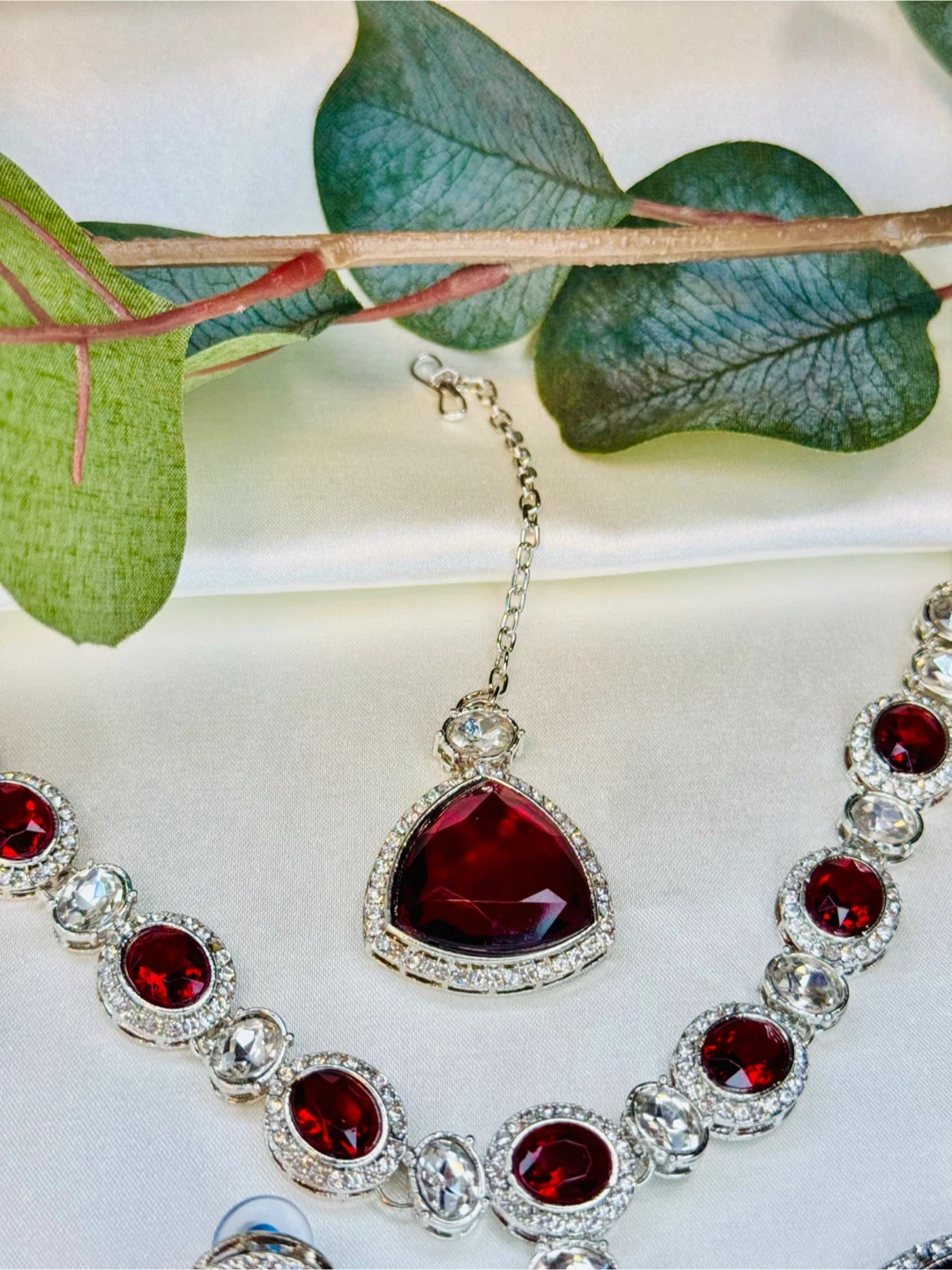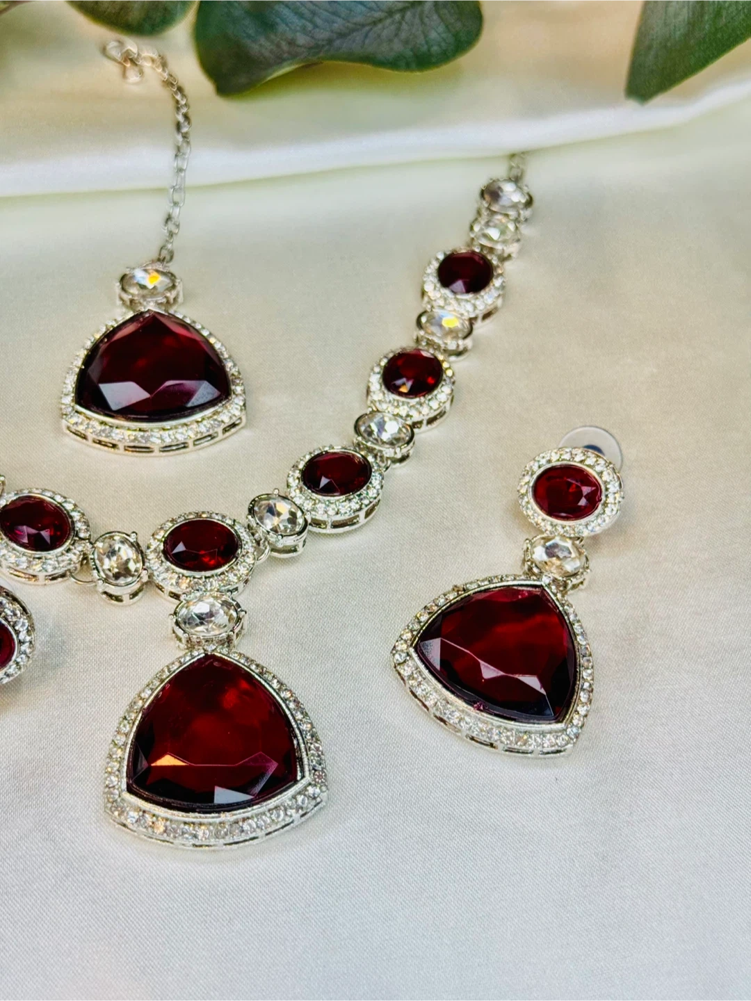 Beautiful 3-piece jewellery set featuring a necklace, drop earrings, and a tikka. Each piece is adorned with deep red triangular gemstones and clear crystals, set in silver-toned metal. It's perfect for adding a touch of elegance to special occasions.