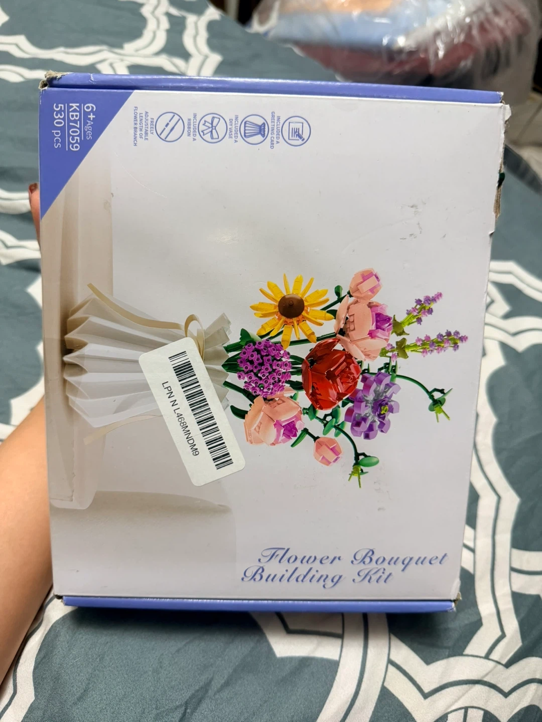 This flower bouquet building kit includes 530 pieces for ages 6 and up. It's a fun and engaging way to create a beautiful floral display. This kit is perfect for anyone who enjoys building and floral arrangements!