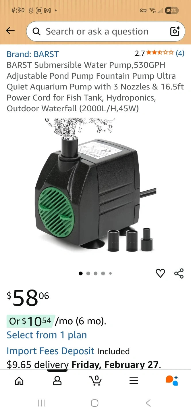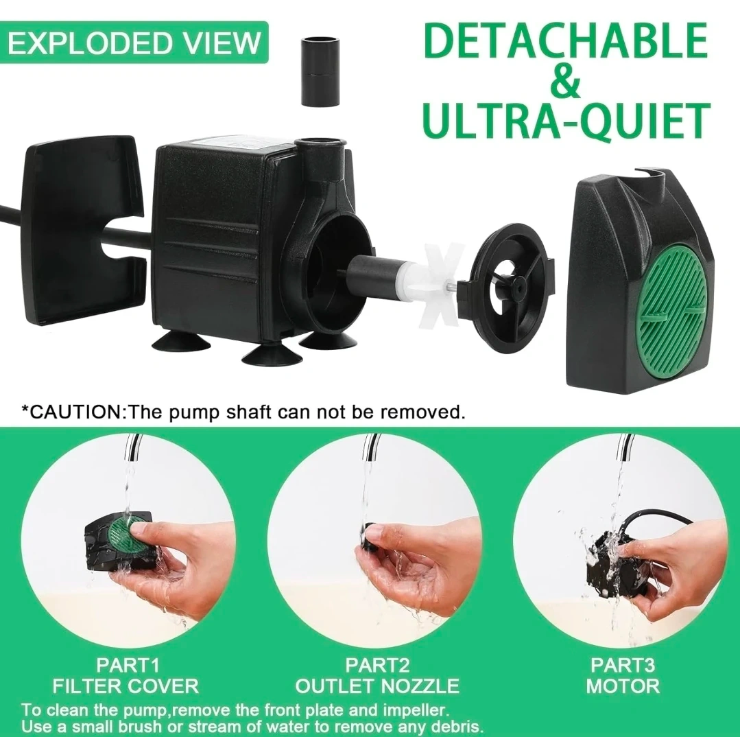 This is a compact and quiet submersible water pump from BARST. It's suitable for fish tanks, ponds, fountains, and hydroponics. The pump comes with two nozzles for your choice. It's detachable and easy to clean.