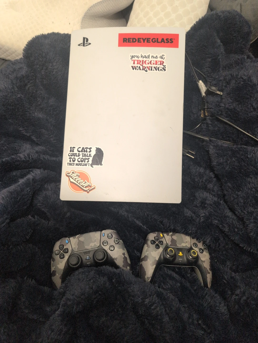 Selling a PlayStation 5 console, complete with two camouflage controllers. The console has some stickers on it, adding a bit of character! The controllers are in great shape and ready for some gaming action also comes with three games