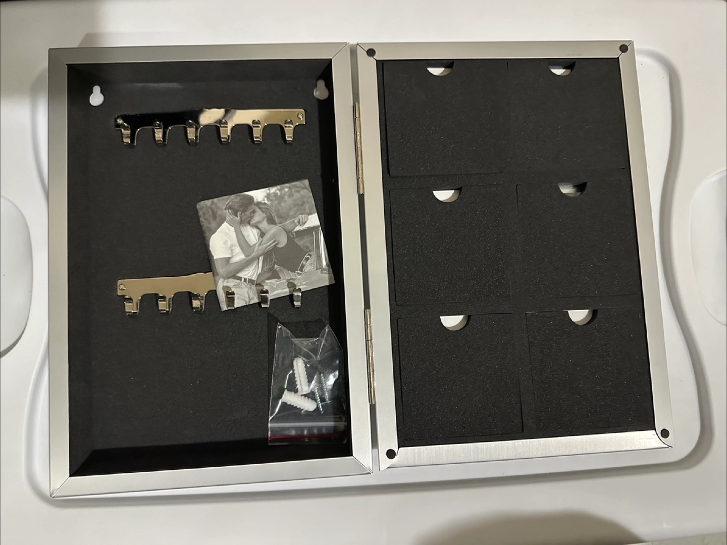 This silver frame holds 6 photos and features a built-in key organizer with hooks. It comes with mounting hardware for easy installation. A lovely way to display memories and keep your keys tidy!