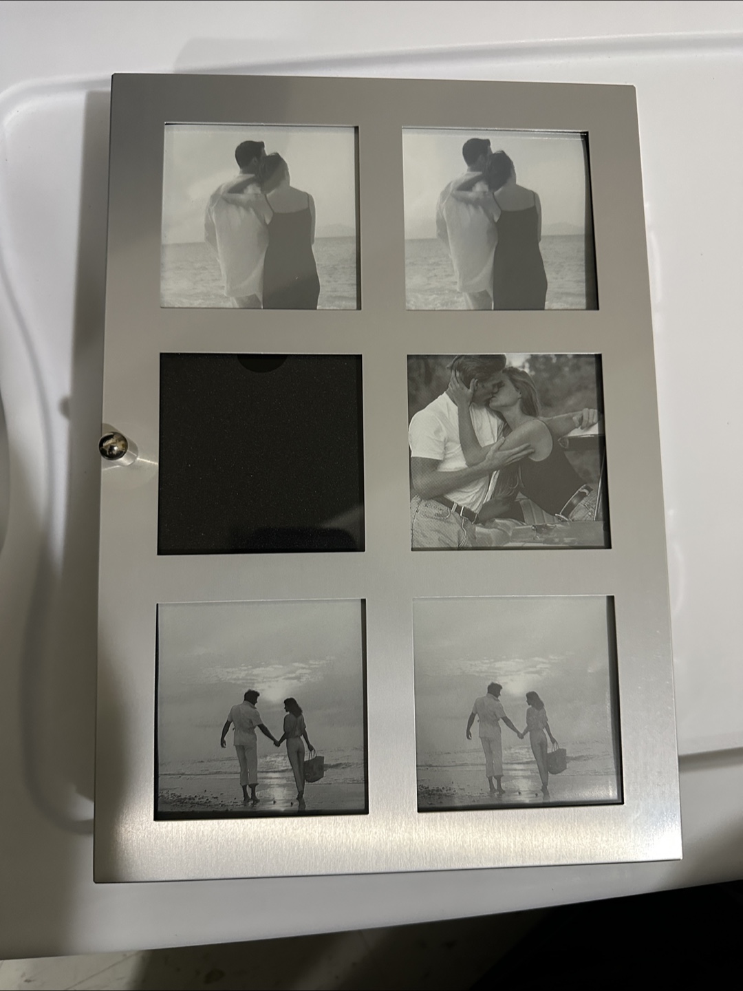 This silver frame holds 6 photos and features a built-in key organizer with hooks. It comes with mounting hardware for easy installation. A lovely way to display memories and keep your keys tidy!