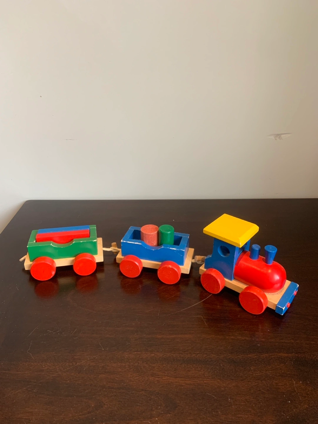 Wooden toy train with three cars. Includes a red engine, a blue car with a removable block insert, and a green car with a removable block insert.